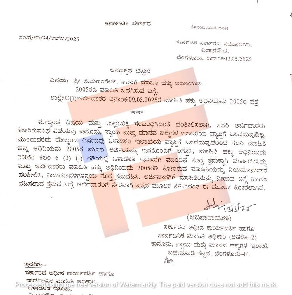‘ರಿಟ್ ಅರ್ಜಿ ಸಂಖ್ಯೆ 27084/2024, 22356/2024 ಅರ್ಜಿಯು ಅಪರಾಧಗಳು ಎ ಶಾಖೆಗೆ ಸಂಬಂಧಿಸಿರದ ಕಾರಣ ಈ ರಿಟ್ ಅರ್ಜಿಯಲ್ಲಿ ವಾದ ಮಂಡಿಸಲು ಕಪಿಲ್ ಸಿಬಲ್ ಅವರನ್ನು ನೇಮಕ ಮಾಡಿರುವುದಿಲ್ಲ. ಮುಂದುವರೆದು ರಿಟ್ ಅರ್ಜಿ ಸಂಖ್ಯೆ 27484/2024ರಲ್ಲಿ ವಾದ ಮಾಡಲು ಕಪಿಲ್ ಸಿಬಲ್ ಅವರನ್ನು ನೇಮಕ ಮಾಡಿರುವುದಿಲ್ಲ. ನ್ಯಾಯಾಲಯದಲ್ಲಿ ಹಾಜರಾಗಿರುವ ಕುರಿತು ಮಾಹಿತಿಯನ್ನು ಅಡ್ವೋಕೇಟ್ ಜನರಲ್ ಕಚೇರಿಯಿಂದ ಪಡೆಯಬಹುದು,’ ಎಂದು 2025ರ ಮೇ 22ರಂದು ಒಳಾಡಳಿತ ಇಲಾಖೆಯು ಹಿಂಬರಹದಲ್ಲಿ ತಿಳಿಸಿದೆ.