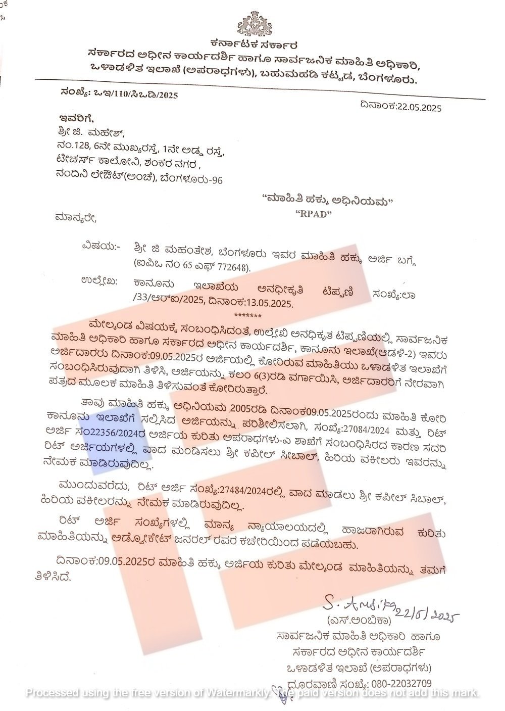 ಇದಕ್ಕೆ 2025ರ ಮೇ 22ರಂದು ಹಿಂಬರಹ ನೀಡಿರುವ ಒಳಾಡಳಿತ ಇಲಾಖೆಯ ಅಪರಾಧ ಶಾಖೆಗಳು ಎ ವಿಭಾಗವು, ಈ ಮಾಹಿತಿಯು ಅಪರಾಧ ಶಾಖೆ – ಎ ವಿಭಾಗಕ್ಕೆ ಸಂಬಂಧಿಸಿಲ್ಲ ಮತ್ತು ಈ ರಿಟ್ ಅರ್ಜಿಗಳಲ್ಲಿ ವಾದ ಮಾಡಲು ಕಪಿಲ್ ಸಿಬಲ್ ಅವರನ್ನು ನೇಮಕ ಮಾಡಿಲ್ಲ ಎಂದು ಉತ್ತರಿಸಿದೆ.