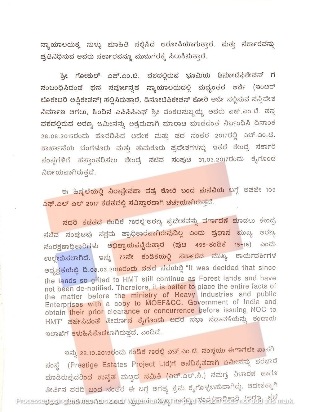 ಅರಣ್ಯ ಸ್ವರೂಪ ಕಳೆದುಕೊಂಡಿದೆ ಎಂದು ಸುಪ್ರೀಂ ಕೋರ್ಟ್ನಲ್ಲಿ ಮಧ್ಯಂತರ ಅರ್ಜಿ ಸಲ್ಲಿಸುವ ಮುನ್ನ ಸಂಬಂಧಿತ ಪ್ರಾಧಿಕಾರಗಳಿಗೆ ಪತ್ರ ಬರೆದು ಸತ್ಯಾಸತ್ಯತೆಯನ್ನು ಖಚಿತಪಡಿಸಿಕೊಂಡಿಲ್ಲ. ಮತ್ತು ಎಚ್ಎಂಟಿ ಪ್ರದೇಶದಲ್ಲಿರುವ ಭೂಮಿ ನಿಜಕ್ಕೂ ಅರಣ್ಯ ಸ್ವರೂಪ ಕಳೆದುಕೊಂಡಿದೆಯೇ, ಇಲ್ಲಿ ಮರ ಗಿಡ ಇದೆಯೇ ಎಂಬ ಬಗ್ಗೆ ಖುದ್ದು ಪರಿಶೀಲನೆ ನಡೆಸಿಲ್ಲ. ಹಾಗೂ ಈ ಸಂಬಂಧಿತ ಯಾವುದೇ ಅಧ್ಯಯನ ವರದಿ ಇಲ್ಲ.