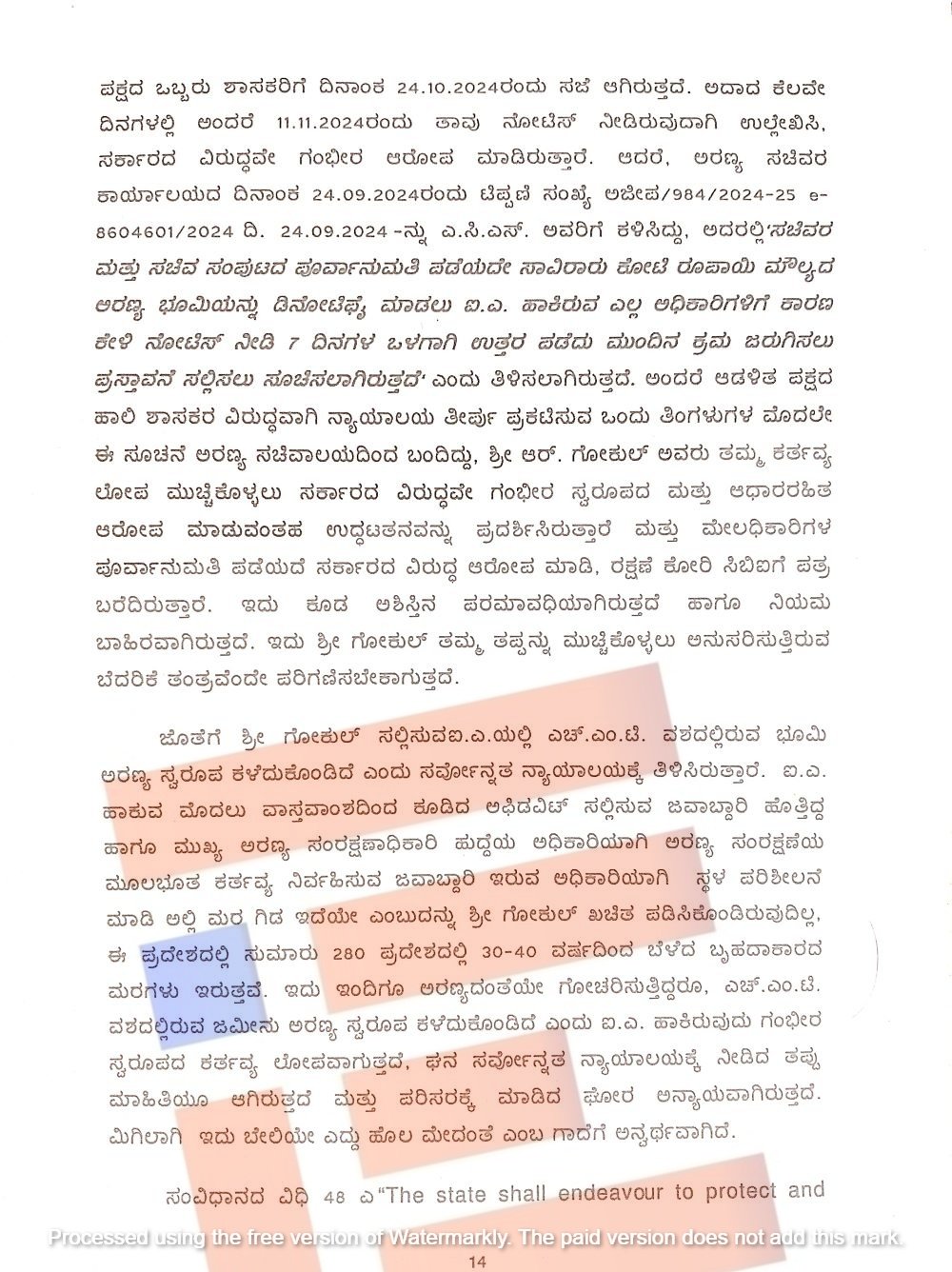 ಹಂಚಿಕೆಯ ಪತ್ರದಲ್ಲಿ ಸರ್ವೇ ನಂಬರ್ ಕೂಡ ಇಲ್ಲ. ಗಿಫ್ಟ್ ಡೀಡ್ ಪ್ರತಿಯಲ್ಲಿ ಸರ್ಕಾರದ ಆದೇಶದ ಪ್ರತಿಗಳೂ ಇಲ್ಲ. ಮತ್ತು ಅರಣ್ಯ ಪ್ರದೇಶವನ್ನು ವರ್ಗಾವಣೆ ಮಾಡಲು ಕೇಂದ್ರ ಸಚಿವ ಸಂಪುಟವೂ ಸಕ್ಷಮ ಪ್ರಾಧಿಕಾರವಾಗಿರುವುದಿಲ್ಲ.