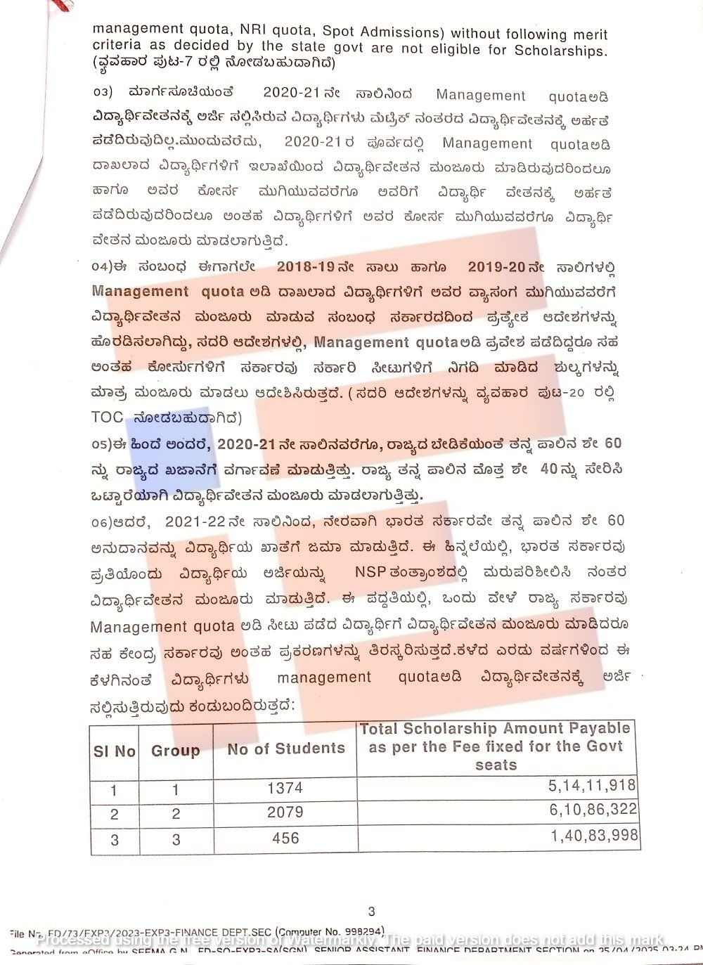 ಕಳೆದ 2 ವರ್ಷಗಳಿಂದ ಒಟ್ಟಾರೆಯಾಗಿ 4,254 ವಿದ್ಯಾರ್ಥಿಗಳು ಮ್ಯಾನೇಜ್ಮೆಂಟ್ ಕೋಟಾದಡಿ ವಿದ್ಯಾರ್ಥಿ ವೇತನಕ್ಕೆ ಅರ್ಜಿ ಸಲ್ಲಿಸಿದ್ದರು. ಇದರ ಪ್ರಕಾರ ಒಟ್ಟು ಮೊತ್ತ 13,21,87,437 ರು.ಗಳಾಗುತ್ತವೆ. ಈ ಪ್ರಸ್ತಾವನೆ ಪ್ರಕಾರ ವಾರ್ಷಿಕವಾಗಿ 13.00 ಕೋಟಿ ರು.ಗಳಿಂದ 15.00 ಕೋಟಿ ರುವರೆಗೆ ರಾಜ್ಯ ತನ್ನ ಪಾಲಿನಲ್ಲಿಯೇ ಪೂರ್ಣ ಅನುದಾನ ಭರಿಸಬೇಕಿದೆ. ಆದರೆ 2020-21 ಹಾಗೂ 2021-22ನೇ ಸಾಲಿನಲ್ಲಿ ಮ್ಯಾನೇಜ್ಮೆಂಟ್ ಕೋಟಾದಡಿ ಸಲ್ಲಿಕೆಯಾಗಿದ್ದ ಅರ್ಜಿಗಳನ್ನು ತಿರಸ್ಕರಿಸಿರುವುದು ಕಡತದ ಟಿಪ್ಪಣಿ ಹಾಳೆಯಿಂದ ತಿಳಿದು ಬಂದಿದೆ.