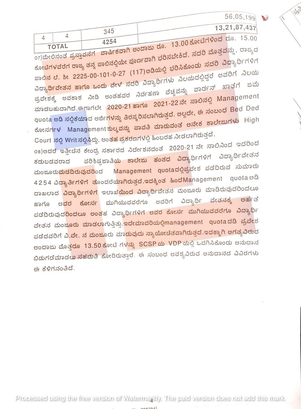 ಕೇಂದ್ರ ಸರ್ಕಾರವು ಇತ್ತೀಚೆಗೆ ಹೊರಡಿಸಿರುವ ನಿರ್ದೇಶನದ ಪ್ರಕಾರ 2020-21ನೇ ಸಾಲಿನಿಂದ ಕಡುಬಡವರಾದ ಪರಿಶಿಷ್ಟ ಜಾತಿಯ ಕಾಲೇಜು ಹಂತದ ವಿದ್ಯಾರ್ಥಿಗಳಿಗೆ ವಿದ್ಯಾರ್ಥಿ ವೇತನ ಮಂಜೂರಾಗಿಲ್ಲ. ಮ್ಯಾನೇಜ್ಮೆಂಟ್ ಕೋಟಾದಡಿಯಲ್ಲಿ ಪ್ರವೇಶ ಪಡೆದಿರುವ ಸುಮಾರು 4,254 ವಿದ್ಯಾರ್ಥಿಗಳಿಗೆ ತೊಂದರೆಯಾಗಿದೆ. ಇದಕ್ಕಾಗಿ ಅಗತ್ಯವಿರುವ 13.50 ಕೋಟಿ ರು.ಗಳನ್ನು ಎಸ್ಸಿಎಸ್ಪಿಯ ವಿಡಿಪಿಯಲ್ಲಿ ಒದಗಿಸಿಕೊಂಡು ಅನುದಾನ ಬಿಡುಗಡೆ ಮಾಡಬೇಕು ಎಂದು ಸಮಾಜ ಕಲ್ಯಾಣ ಇಲಾಖೆಯು ಆರ್ಥಿಕ ಇಲಾಖೆಗೆ ಪ್ರಸ್ತಾವನೆ ಸಲ್ಲಿಸಿತ್ತು.