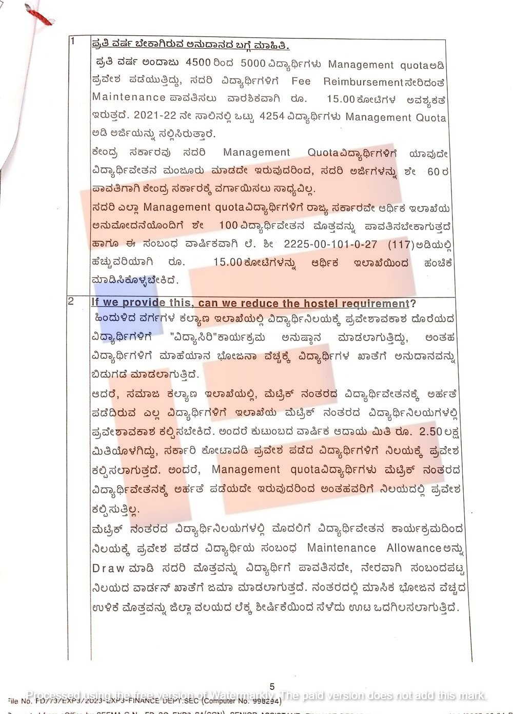 ‘ಪ್ರತಿ ವರ್ಷ ಅಂದಾಜು 4,500ರಿಂದ 5,000 ವಿದ್ಯಾರ್ಥಿಗಳು ಮ್ಯಾನೇಜ್ಮೆಂಟ್ ಕೋಟಾದಡಿ ಪ್ರವೇಶ ಪಡೆಯುತ್ತಿದ್ದಾರೆ. ಈ ವಿದ್ಯಾರ್ಥಿಗಳಿಗೆ ಶುಲ್ಕ ಮರುಪಾವತಿ, ನಿರ್ವಹಣೆ ವೆಚ್ಚವನ್ನು ಪಾವತಿಸಲು ವಾರ್ಷಿಕವಾಗಿ 15.00 ಕೋಟಿ ಅವಶ್ಯಕತೆ ಇದೆ. ಕೇಂದ್ರ ಸರ್ಕಾರವು ಮ್ಯಾನೇಜ್ಮೆಂಟ್ ಕೋಟಾ ವಿದ್ಯಾರ್ಥಿಗಳಿಗೆ ಯಾವುದೇ ವಿದ್ಯಾರ್ಥಿ ವೇತನ ಮಂಜೂರು ಮಾಡದ ಕಾರಣ ಈ ಅರ್ಜಿಗಳನ್ನು 4,254 ಅರ್ಜಿಗಳನ್ನು ಶೇ.60ರ ಪಾವತಿಗಾಗಿ ಕೇಂದ್ರ ಸರ್ಕಾರಕ್ಕೆ ವರ್ಗಾಯಿಸಲು ಸಾಧ್ಯವಿಲ್ಲ. ಈ ಎಲ್ಲಾ ವಿದ್ಯಾರ್ಥಿಗಳಿಗೆ ರಾಜ್ಯ ಸರ್ಕಾರವೇ ಶೇ.100ರಷ್ಟು ವಿದ್ಯಾರ್ಥಿ ವೇತನವನ್ನು ಪಾವತಿಸಬೇಕು. ಇದಕ್ಕಾಗಿ ಹೆಚ್ಚುವರಿಯಾಗಿ 15.00 ಕೋಟಿ ರು.ಗಳನ್ನು ಆರ್ಥಿಕ ಇಲಾಖೆಯಿಂದ ಹಂಚಿಕೆ ಮಾಡಿಸಿಕೊಳ್ಳಬೇಕಿದೆ,’ ಎಂದು ಪ್ರಸ್ತಾವನೆಯಲ್ಲಿ ಸಮಾಜ ಕಲ್ಯಾಣ ಇಲಾಖೆಯು ಕೋರಿತ್ತು.