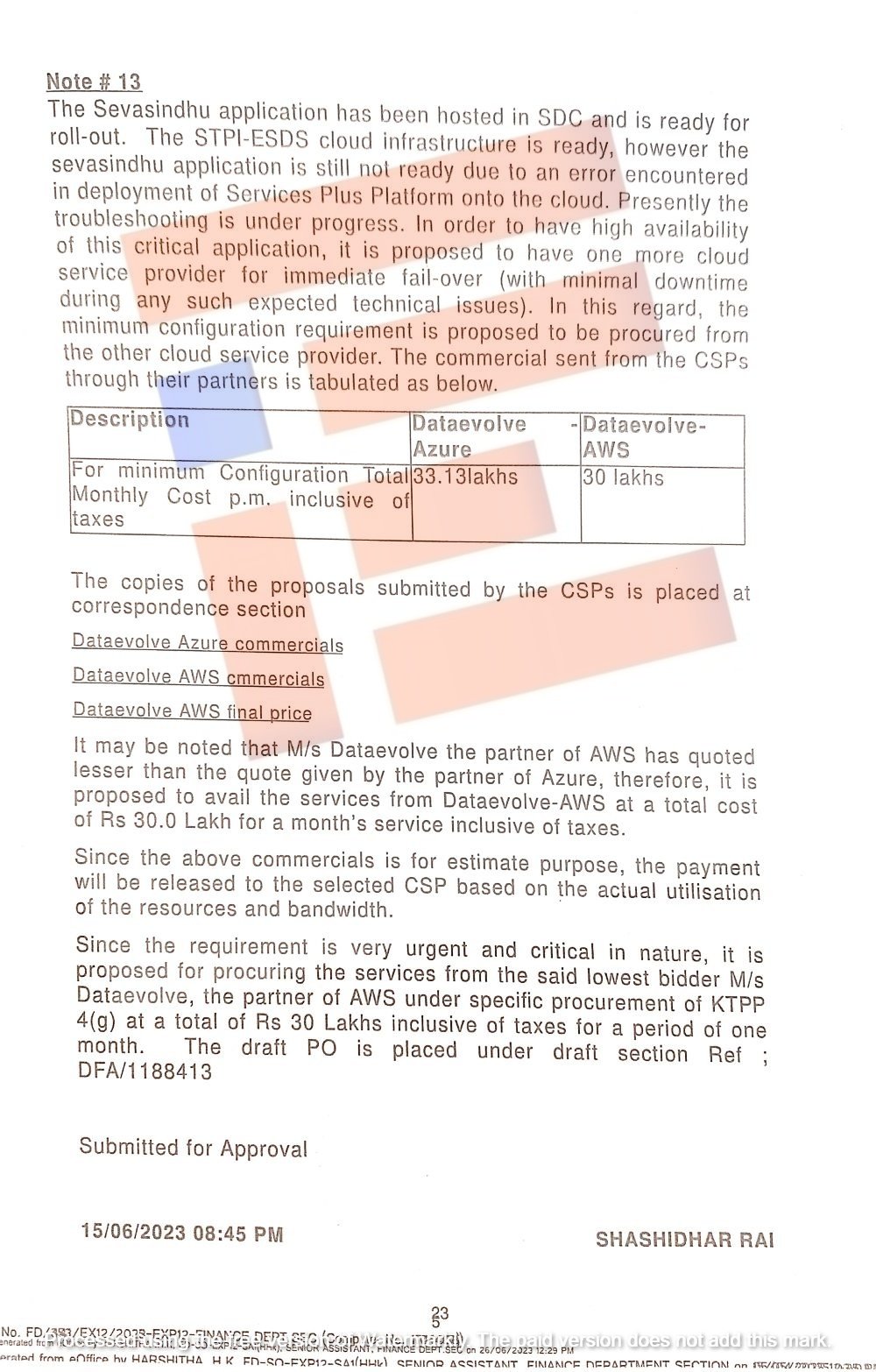 ಈ ಸಂಬಂಧ ಎಡಬ್ಲ್ಯೂಎಸ್ ನ ಪಾಲುದಾರರಾದ m/s dataevolve ನಿಂದ ಒಟ್ಟು 30 ಲಕ್ಷ ರುಪಾಯಿಗಳಿಗೆ ಕ್ಲೌಡ್ ಸೇವೆ ಪಡೆಯಲು ದರ ಪಟ್ಟಿಯನ್ನು ಒದಗಿಸಿತ್ತು ಎಂಬುದು ಟಿಪ್ಪಣಿ ಹಾಳೆಯಿಂದ ಗೊತ್ತಾಗಿದೆ.