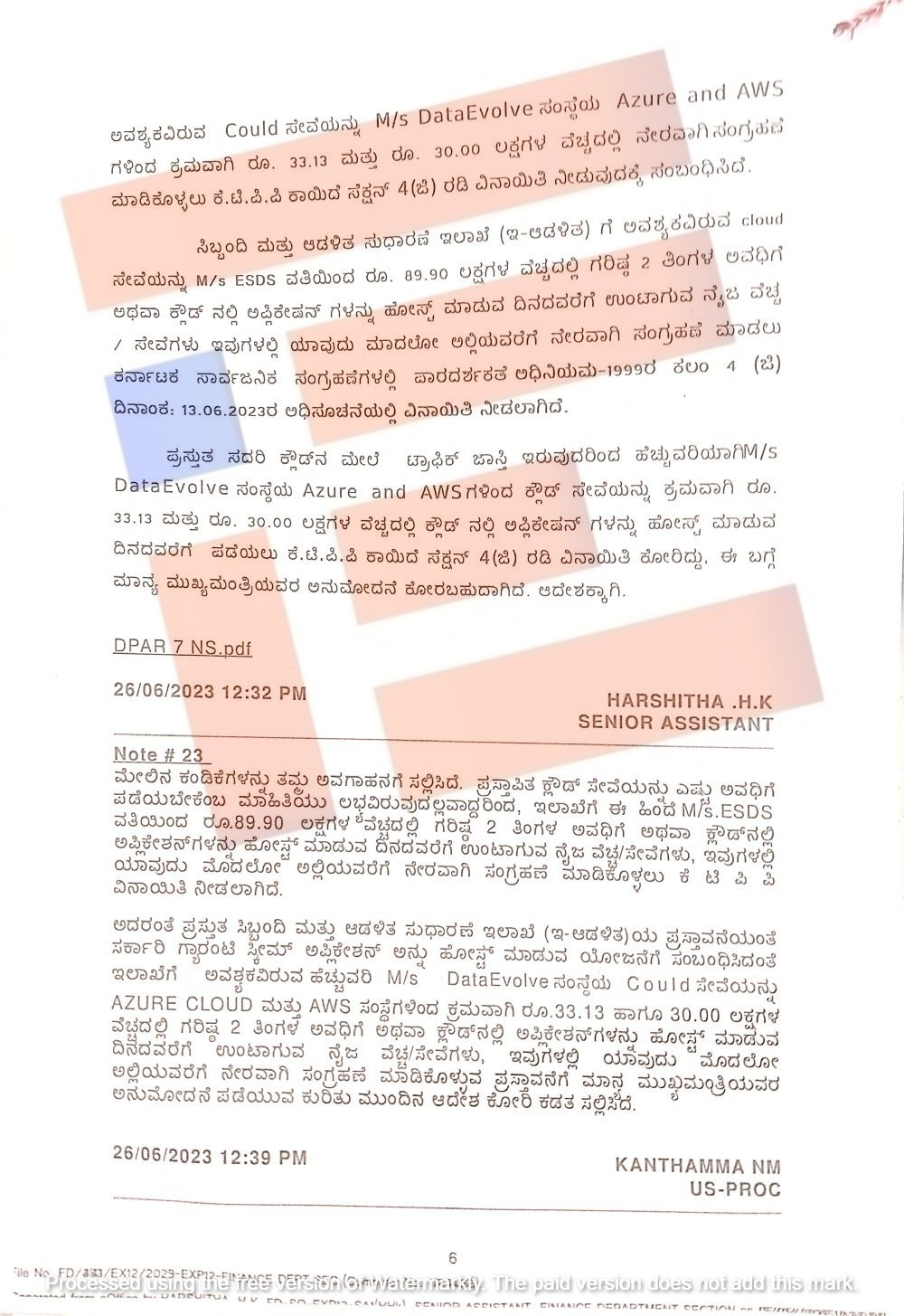 ಇದನ್ನೂ ಪರಿಶೀಲಿಸಿದ್ದ ಆರ್ಥಿಕ ಇಲಾಖೆಯು m/s dataevolve ನಿಂದ ಕ್ರಮವಾಗಿ 33.13 ಲಕ್ಷ ಮತ್ತು 30.00 ಲಕ್ಷ ರು ವೆಚ್ಚದಲ್ಲಿ ಕ್ಲೌಡ್ ಸೇವೆ ಪಡೆಯಲು 2023ರ ಜೂನ್ 28ರಂದು ಅಧಿಸೂಚನೆ ಹೊರಡಿಸಿತ್ತು.