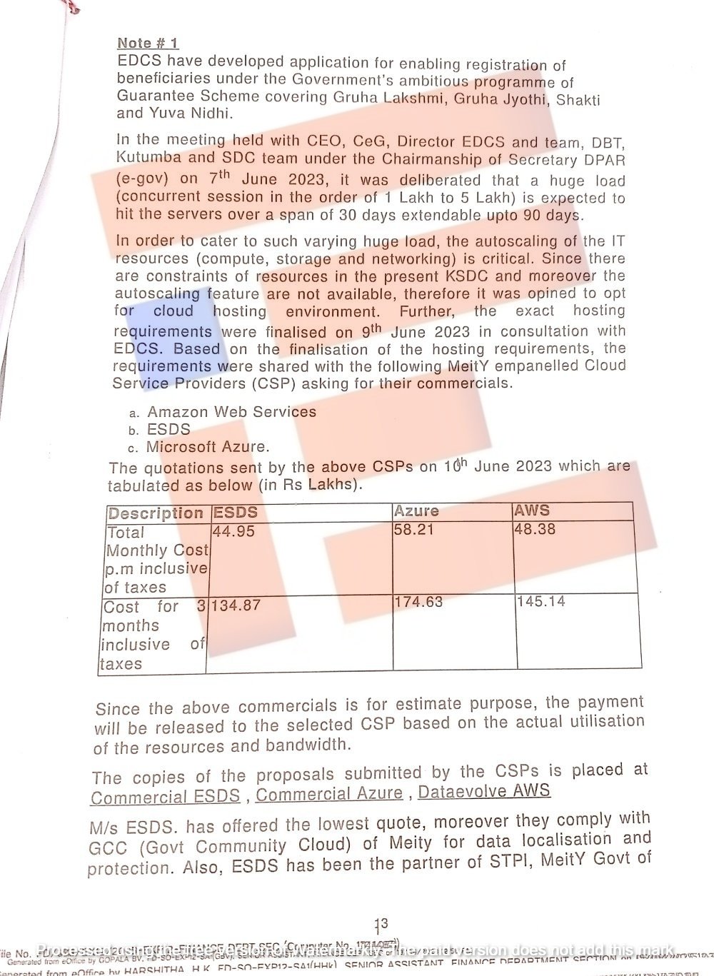 ‘ಆದ್ದರಿಂದ 3 ಹೆಸರಾಂತ ಸೇವಾ ಪೂರೈಕೆದಾರರಿಂದ ಕೋಟೇಶನ್ಗಳನ್ನು ಕೋರಲಾಗಿದೆ. ಇಎಸ್ಡಿಎಸ್ನಲ್ಲಿ, Azure and AWSಗೆ ಹೋಲಿಸಿದರೆ ಸಿಎಸ್ಪಿ ತೆರಿಗೆಗಳನ್ನು ಒಳಗೊಂಡಂತೆ ಕನಿಷ್ಠ 44.95 ಲಕ್ಷ ಪ್ರತಿ ತಿಂಗಳಿಗೆ ವೆಚ್ಚವಾಗಲಿದೆ,’ ಎಂದು ಉಲ್ಲೇಖಿಸಿತ್ತು.