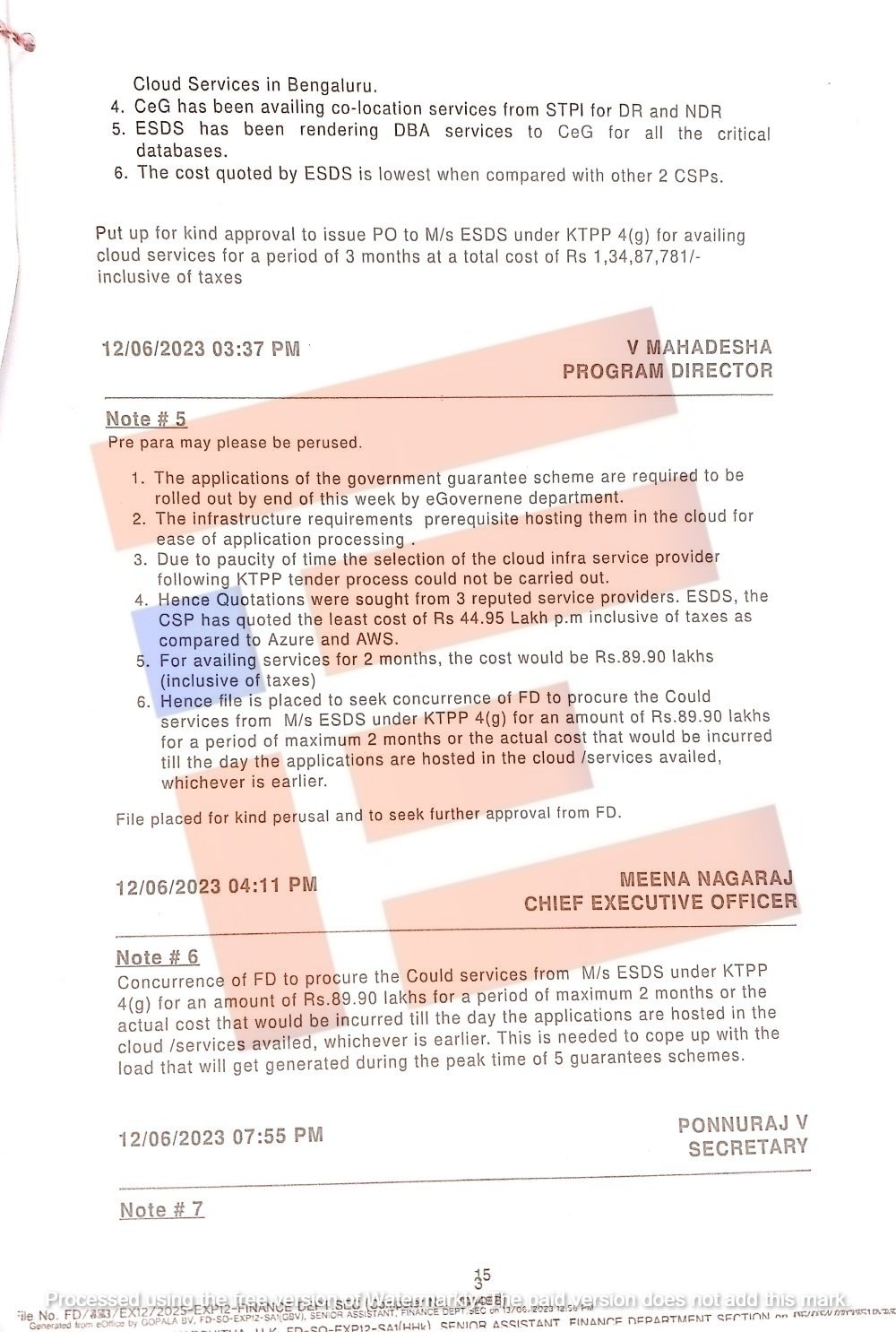 ಇದನ್ನು ಪರಿಶೀಲಿಸಿದ್ದ ಆರ್ಥಿಕ ಇಲಾಖೆಯು 4 (ಜಿ) ವಿನಾಯಿತಿಯನ್ನು ನೀಡಿತ್ತು. 2023ರ ಜೂನ್ 13ರಂದು ಇಎಸ್ಡಿಎಸ್ನಿಂದ 89.90 ಲಕ್ಷ ರು. ವೆಚ್ಚದಲ್ಲಿ ಗರಿಷ್ಠ 2 ತಿಂಗಳ ಅವಧಿಗೆ ಅಥವಾ ಕ್ಲೌಡ್ನಲ್ಲಿ ಅಪ್ಲಿಕೇಷನ್ಗಳನ್ನು ಹೋಸ್ಟ್ ಮಾಡಲು ಅಧಿಸೂಚನೆ ಹೊರಡಿಸಿತ್ತು. ಇದಕ್ಕೆ ಮುಖ್ಯಮಂತ್ರಿ ಸಿದ್ದರಾಮಯ್ಯ ಅವರು ಅನುಮೋದಿಸಿದ್ದರು.
