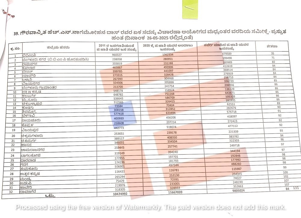 ‘2011ರ ಜನಗಣತಿಯಲ್ಲಿ ಪರಿಶಿಷ್ಟ ಜಾತಿಯ ಒಟ್ಟು ಜನಸಂಖ್ಯೆ 1.05 ಕೋಟಿಯಲ್ಲಿ 7.29 ಲಕ್ಷ ಜನರು ಯಾವುದೇ ಉಪ ಜಾತಿಗಳನ್ನು ನಮೂದಿಸಿರುವುದಿಲ್ಲ. ಕಾರಣ ಒಟ್ಟಾರೆ ಜಾತಿವಾರು ನಿಖರ ಜನಸಂಖ್ಯೆ 97.56 ಲಕ್ಷ ಎಂದು ಪರಿಗಣಿಸಲಾಗಿದೆ. ಈ ಜನಸಂಖ್ಯೆಯಲ್ಲಿ ಆದಿ ಕರ್ನಾಟಕ ಜನಸಂಖ್ಯೆ 29.21 ಲಕ್ಷ ಮತ್ತು ಆದಿ ದ್ರಾವಿಡರು 7.95 ಲಕ್ಷ ಸಂಖ್ಯೆಯಲ್ಲಿದ್ದಾರೆ,’ ಎಂದು ಟಿಪ್ಪಣಿಯಲ್ಲಿ ಅಂಕಿ ಅಂಶಗಳನ್ನು ಒದಗಿಸಿರುವುದು ತಿಳಿದು ಬಂದಿದೆ.