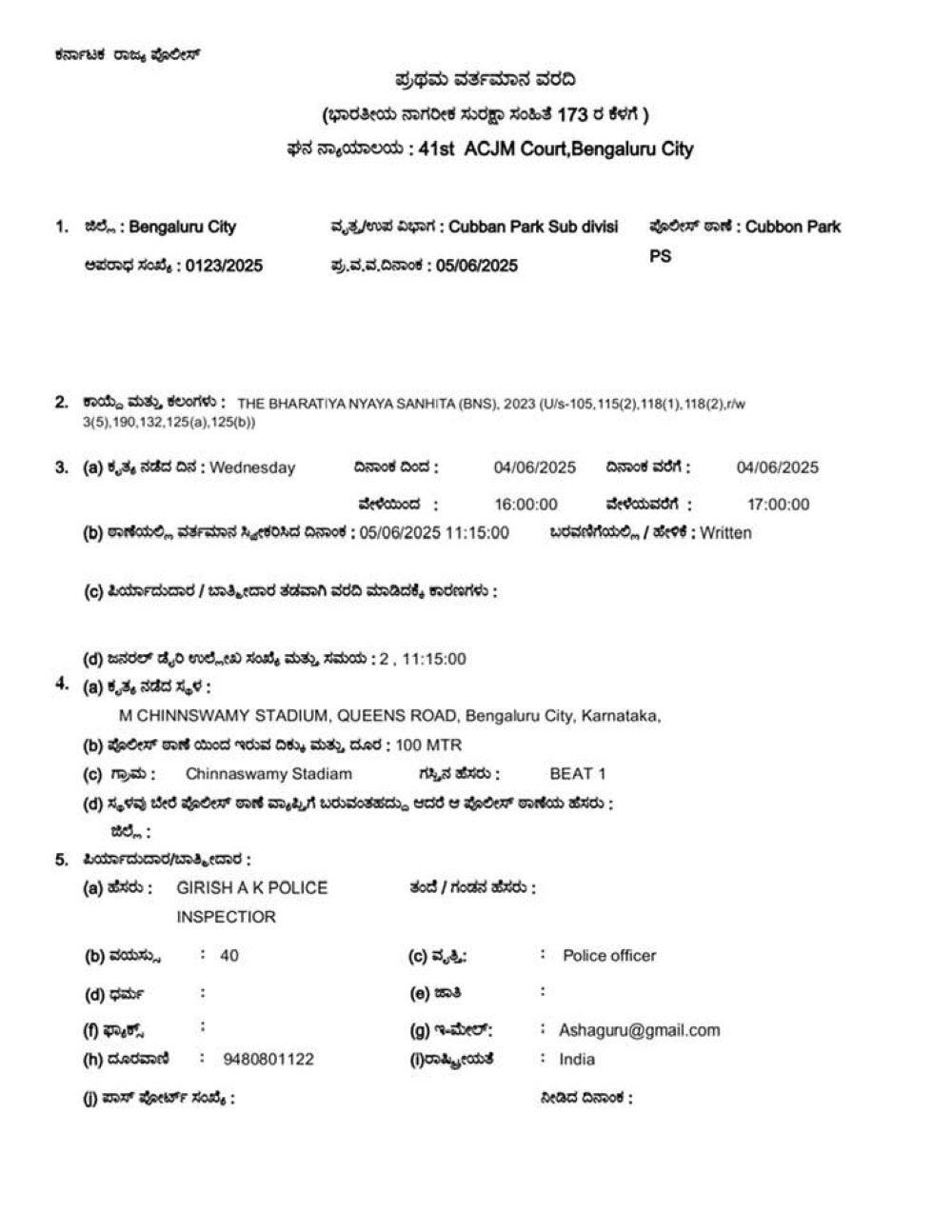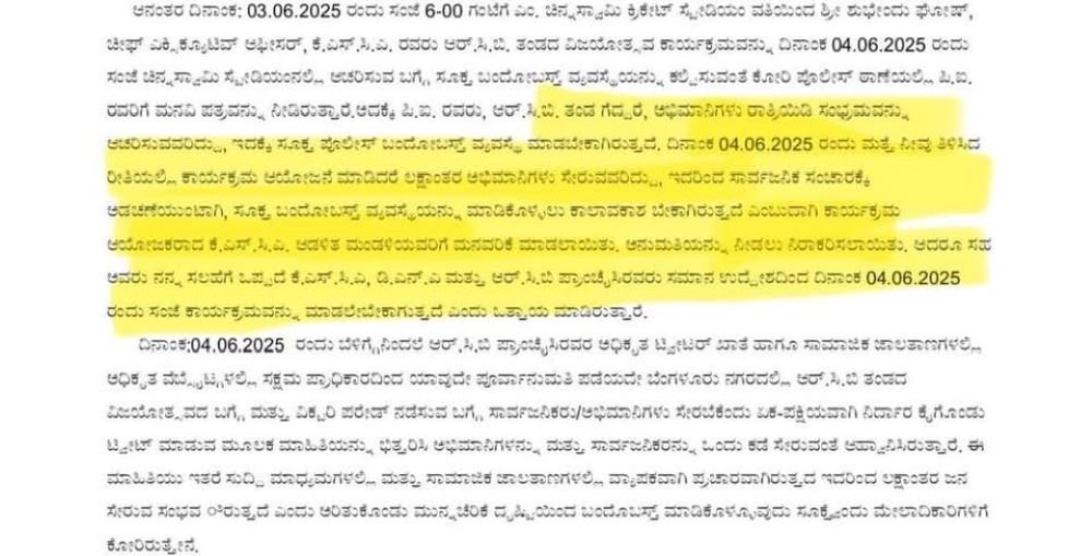 ಅನುಮತಿಯನ್ನು ನೀಡಲು ನಿರಾಕರಿಸಲಾಯಿತು. ಆದರೂ ಸಹ ಅವರು ನನ್ನ ಸಲಹೆಗೆ ಒಪ್ಪಲಿಲ್ಲ. ಕೆಎಸ್ಸಿಎ, ಡಿಎನ್ಎ ಮತ್ತು ಆರ್ಸಿಬಿ ಪ್ರಾಂಚೈಸಿಯವರು ಸಮಾನ ಉದ್ದೇಶದಿಂದ 2025ರ ಜೂನ್ 4ರಂದು ಸಂಜೆ ಕಾರ್ಯಕ್ರಮವನ್ನು ಮಾಡಲೇಬೇಕಾಗುತ್ತದೆ ಎಂದು ಒತ್ತಾಯ ಮಾಡಿರುತ್ತಾರೆ ಎಂದು ಪೊಲೀಸ್ ಇನ್ಸ್ಪೆಕ್ಟರ್ ಅವರು ದೂರಿನಲ್ಲಿ ವಿವರಿಸಿರುವುದು ಗೊತ್ತಾಗಿದೆ.