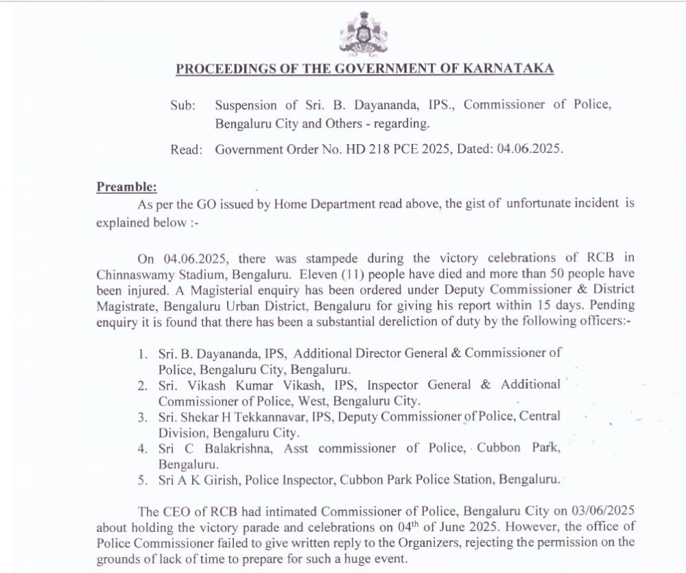 ಬೆಂಗಳೂರು; ರಾಯಲ್ ಚಾಲೆಂಜರ್ಸ್ ಬೆಂಗಳೂರು ತಂಡ ಐಪಿಎಲ್ ಟ್ರೋಫಿ ಗೆದ್ದ ಹಿನ್ನೆಲೆಯಲ್ಲಿ ಹಮ್ಮಿಕೊಂಡಿದ್ದ ಸಂಭ್ರಮಾಚರಣೆಗೆ ಪೊಲೀಸ್ ಇನ್ಸ್ಪೆಕ್ಟರ್ ಗಿರೀಶ್ ಅವರು ಅನುಮತಿ ನಿರಾಕರಿಸಿದ್ದ ಪೊಲೀಸ್ ಇನ್ಸ್ಪೆಕ್ಟರ್ ಗಿರೀಶ್ ಅವರನ್ನೂ ಸಹ ಅಮಾನತುಗೊಳಿಸಿರುವುದು ಪೊಲೀಸ್ ಇಲಾಖೆಯಲ್ಲಿ ತೀವ್ರ ವಿರೋಧಕ್ಕೆ ಕಾರಣವಾಗಿದೆ.