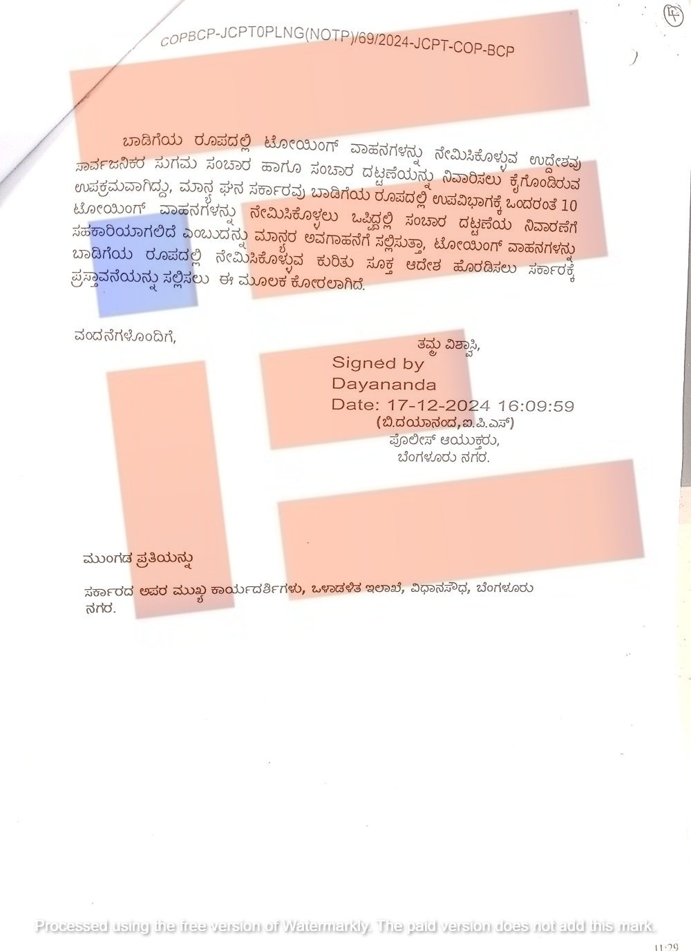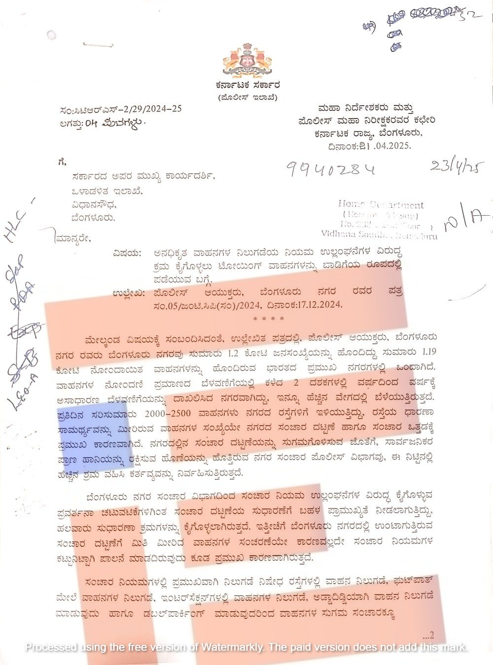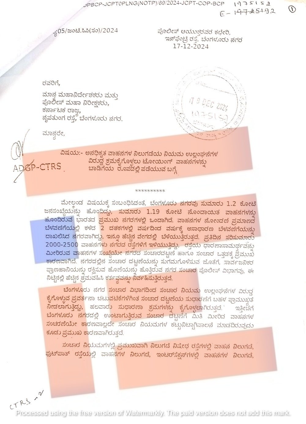 ‘ಬೆಂಗಳೂರು ನಗರ ಸಂಚಾರ ವಿಭಾಗದಿಂದ ಸಂಚಾರ ನಿಯಮಗಳ ಉಲ್ಲಂಘನೆಗಳ ವಿರುದ್ಧ ಕೈಗೊಳ್ಳುವ ಪ್ರವರ್ತನಾ ಚಟುವಟಿಕೆಗಳಿಗಿಂತ ಸಂಚಾರ ದಟ್ಟಣೆಯ ಸುಧಾರಣೆಗೆ ಬಹಳ ಪ್ರಾಮುಖ್ಯತೆ ನೀಡಲಾಗುತ್ತಿದೆ. ಹಲವಾರು ಸುಧಾರಣೆ ಕ್ರಮಗಳನ್ನು ಕೈಗೊಳ್ಳಲಾಗುತ್ತಿದೆ. ಇತ್ತೀಚೆಗೆ ಬೆಂಗಳೂರು ನಗರದಲ್ಲಿ ಉಂಟಾಗುತ್ತಿರುವ ಸಂಚಾರ ದಟ್ಟಣೆಗೆ ಮಿತಿ ಮೀರಿದ ವಾಹನಗಳ ಸಂಚರಣೆಯೇ ಕಾರಣವಾಗಿದೆ ಮತ್ತು ಸಂಚಾರ ನಿಯಮಗಳ ಕಟ್ಟುನಿಟ್ಟಾಗಿ ಪಾಲನೆ ಮಾಡದಿರುವುದು ಕೂಡ ಪ್ರಮುಖ ಕಾರಣವಾಗಿದೆ,’ ಎಂದು ಪತ್ರದಲ್ಲಿ ವಿವರಿಸಿದ್ದರು.