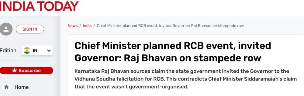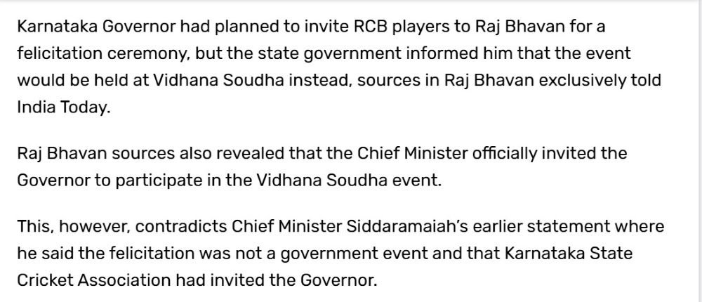 ಇದೀಗ ಇಂಡಿಯಾ ಟುಡೆಯು ರಾಜಭವನ ಮೂಲಗಳನ್ನಾಧರಿಸಿ ಪ್ರಕಟಿಸಿರುವ ವರದಿಯಲ್ಲಿ ರಾಜ್ಯಪಾಲರನ್ನು ಮುಖ್ಯಮಂತ್ರಿ ಸಿದ್ದರಾಮಯ್ಯ ಅವರೇ ಆರ್ಸಿಬಿ ಸಂಭ್ರಮಾಚರಣೆಗೆ ಅಧಿಕೃತವಾಗಿ ಆಹ್ವಾನಿಸಿದ್ದರು ಎಂದು ಹೇಳಲಾಗಿದೆ.