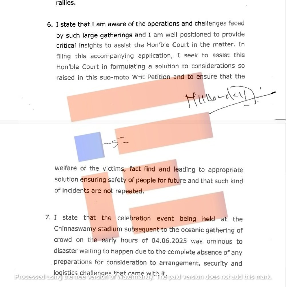 ಚಿನ್ನಸ್ವಾಮಿ ಕ್ರೀಡಾಂಗಣದಲ್ಲಿ ಸಂಭವಿಸಿದ ಕಾಲ್ತುಳಿತ ಘಟನೆಗೆ ಸಂಬಂಧಿಸಿದಂತೆ ಕರ್ನಾಟಕ ಹೈಕೋರ್ಟ್ ಸ್ವಯಂ ಪ್ರೇರಿತ ಪ್ರಕರಣವನ್ನು ದಾಖಲಿಸಿಕೊಂಡು ವಿಚಾರಣೆ ನಡೆಸುತ್ತಿರುವ ಹೊತ್ತಿನಲ್ಲೇ ಕರ್ನಾಟಕ ವಿಧಾನಪರಿಷತ್ನ ಮಾಜಿ ಸದಸ್ಯ ಮೋಹನ್ ಕೊಂಡಜ್ಜಿ ಅವರು ವಿಪತ್ತು ನಿರ್ವಹಣೆ ಅಂಶಗಳನ್ನು ಹೈಕೋರ್ಟ್ನ ಮುಂದಿರಿಸಿದ್ದಾರೆ.