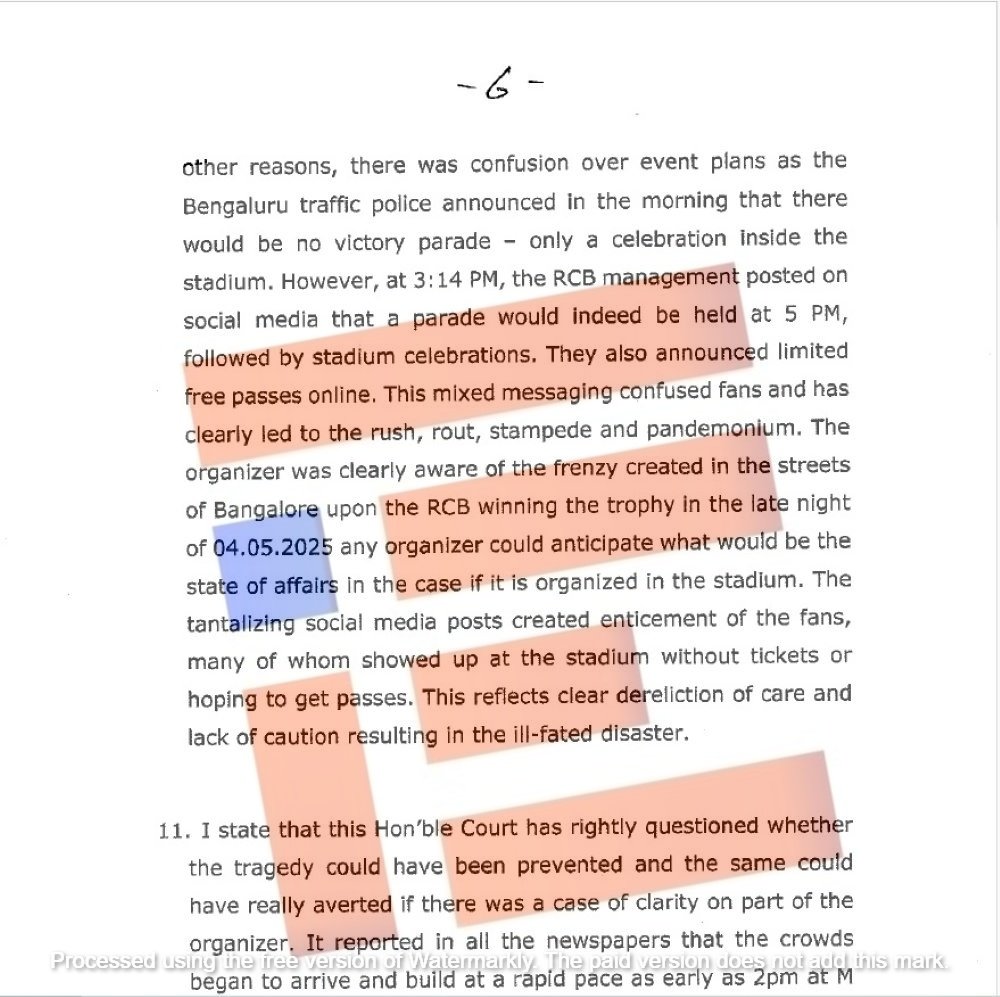 ಮೆರವಣಿಗೆ ಸಮಯ ಮತ್ತು ಉಚಿತ ಪಾಸ್ಗಳ ಕುರಿತು ಹಲವಾರು ಸಾಮಾಜಿಕ ಮಾಧ್ಯಮಗಳಲ್ಲಿ ಪ್ರಕಟವಾಗಿದ್ದು ಸಹ ಮತ್ತಷ್ಟು ಗೊಂದಲ ಉಂಟಾಗಿತ್ತು. ವಿಜಯೋತ್ಸವ ಮೆರವಣಿಗೆ ಇರುವುದಿಲ್ಲ, ಕ್ರೀಡಾಂಗಣದೊಳಗೆ ಕೇವಲ ಆಚರಣೆ ಇರುತ್ತದೆ ಎಂದು ಬೆಳಿಗ್ಗೆ ಬೆಂಗಳೂರು ಸಂಚಾರ ಪೊಲೀಸರು ಘೋಷಿಸಿದ್ದರಿಂದ ಕಾರ್ಯಕ್ರಮದ ಯೋಜನೆಗಳ ಕುರಿತು ಗೊಂದಲ ಉಂಟಾಗಿತ್ತು ಎಂದು ಅರ್ಜಿಯಲ್ಲಿ ಗಮನಸೆಳೆದಿರುವುದು ಗೊತ್ತಾಗಿದೆ.