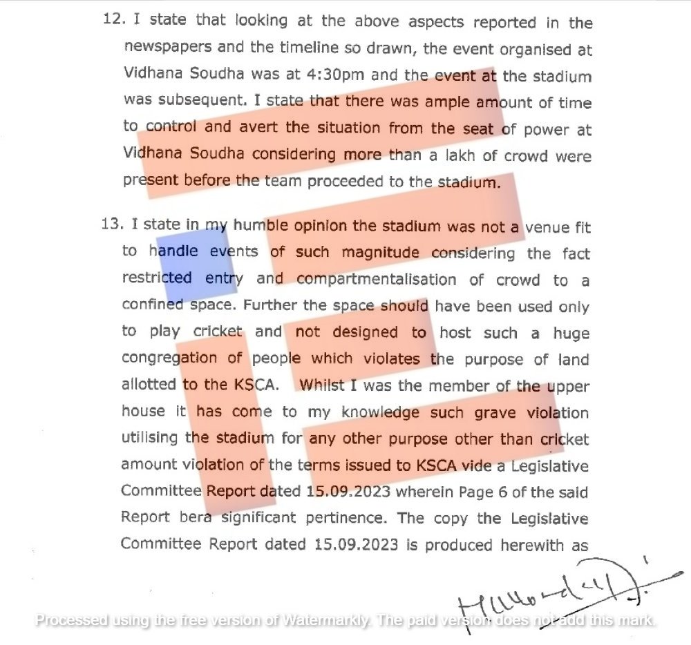 ‘ಇದಲ್ಲದೆ, ಈ ಸ್ಥಳವನ್ನು ಕ್ರಿಕೆಟ್ ಆಡಲು ಮಾತ್ರ ಬಳಸಬೇಕಿತ್ತು. ಮತ್ತು ಇಷ್ಟು ದೊಡ್ಡ ಜನರ ಸಭೆಯನ್ನು ಆಯೋಜಿಸಬಾರದಿತ್ತು. ಇದು ಕೆಎಸ್ಸಿಎಗೆ ನೀಡಲಾದ ಭೂಮಿಯ ಉದ್ದೇಶವನ್ನು ಉಲ್ಲಂಘಿಸುತ್ತದೆ. ಕ್ರಿಕೆಟ್ ಹೊರತುಪಡಿಸಿ ಬೇರೆ ಯಾವುದೇ ಉದ್ದೇಶಕ್ಕಾಗಿ ಕ್ರೀಡಾಂಗಣವನ್ನು ಬಳಸಿರುವುದು ಗಂಭೀರ ಉಲ್ಲಂಘನೆಯಾಗಿದೆ ಎಂದು ನನಗೆ ತಿಳಿದುಬಂದಿದೆ. ಶಾಸಕಾಂಗ ಸಮಿತಿಯ ವರದಿಯ ಪ್ರಕಾರ ಕೆಎಸ್ಸಿಎಗೆ ನೀಡಲಾದ ನಿಯಮಗಳ ಉಲ್ಲಂಘನೆಯಾಗಿದೆ,’ ಎಂದು ಸದನ ಸಮಿತಿಯ ಸಭೆ ನಡವಳಿಗಳನ್ನು ಉಲ್ಲೇಖಿಸಿ ಹೇಳಿರುವುದು ಗೊತ್ತಾಗಿದೆ.
