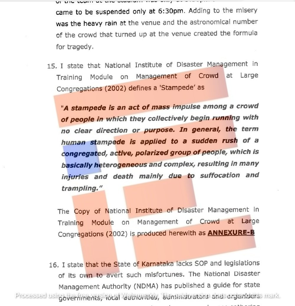 ಇದರ ಪ್ರಕಾರ ‘ಕಾಲ್ತುಳಿತವು ಸ್ಪಷ್ಟ ನಿರ್ದೇಶನ ಅಥವಾ ಉದ್ದೇಶವಿಲ್ಲದೆ ಸಾಮೂಹಿಕವಾಗಿ ಓಡಲು ಪ್ರಾರಂಭಿಸುವ ಜನರ ಗುಂಪಿನಲ್ಲಿ ಸಾಮೂಹಿಕ ಪ್ರಚೋದನೆಯ ಕ್ರಿಯೆಯಾಗಿದೆ. ಸಾಮಾನ್ಯವಾಗಿ, ಮಾನವ ಕಾಲ್ತುಳಿತ ಎಂಬ ಪದವನ್ನು ಜನರು ಗುಂಪುಗೂಡುವ, ಸಕ್ರಿಯ, ಧ್ರುವೀಕೃತ ಗುಂಪಿನ ಹಠಾತ್ ಧಾವಿಸುವಿಕೆಗೆ ಅನ್ವಯಿಸಲಾಗುತ್ತದೆ. ಇದು ಮೂಲತಃ ದ್ವೇಷಪೂರಿತ ಮತ್ತು ಸಂಕೀರ್ಣವಾಗಿದೆ. ಮುಖ್ಯವಾಗಿ ಉಸಿರುಗಟ್ಟುವಿಕೆ ಮತ್ತು ತುಳಿತದಿಂದಾಗಿ ಅನೇಕ ಗಾಯಗಳು ಮತ್ತು ಸಾವುಗಳಿಗೆ ಕಾರಣವಾಗುತ್ತದೆ,’ ಎಂದು ವ್ಯಾಖ್ಯಾನಿಸಿದೆ ಎಂದು ಅರ್ಜಿಯಲ್ಲಿ ಗಮನಸೆಳೆದಿರುವುದು ತಿಳಿದು ಬಂದಿದೆ.