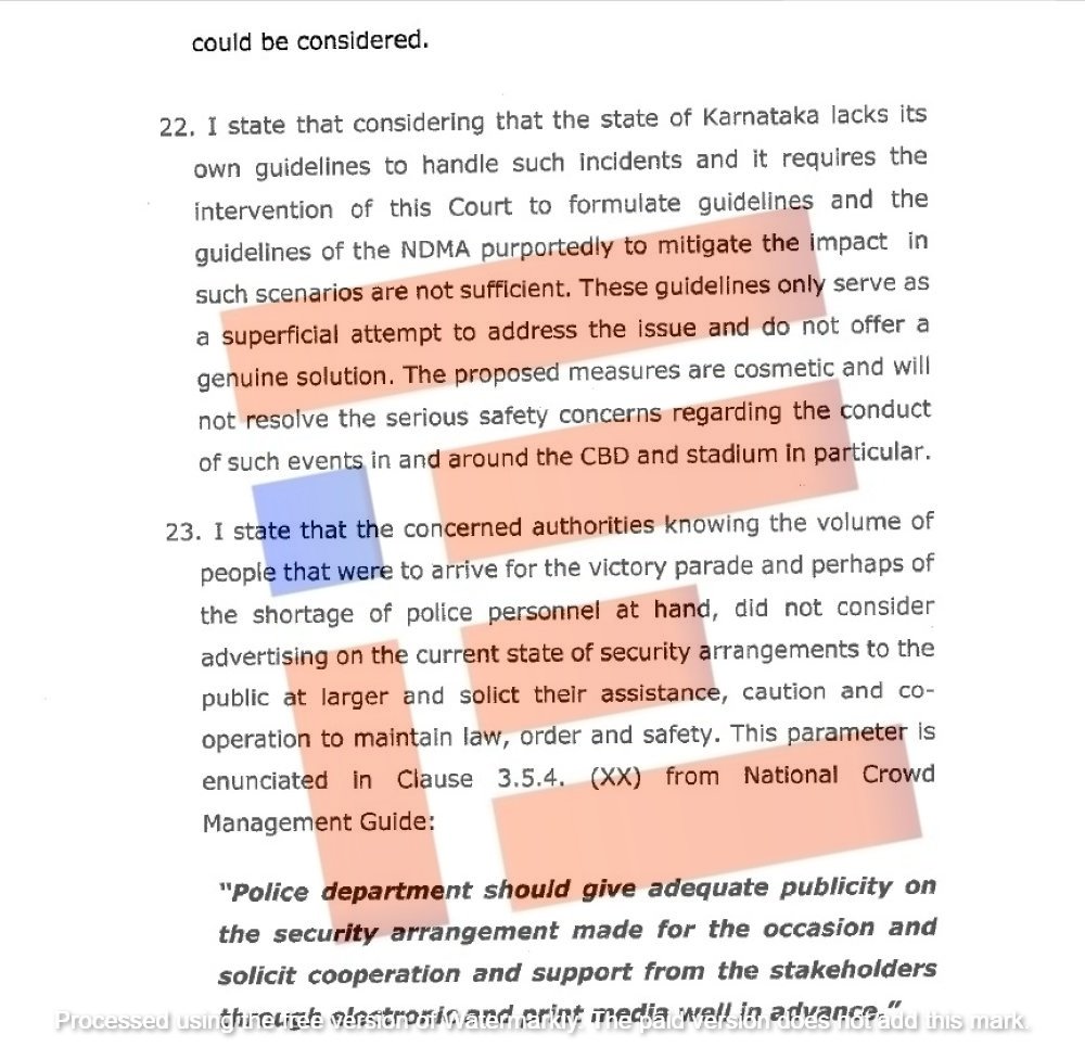 ಬೆಂಗಳೂರು; ಆರ್ಸಿಬಿ ಸಂಭ್ರಮಾಚರಣೆಯನ್ನು ಚಿನ್ನಸ್ವಾಮಿ ಕ್ರೀಡಾಂಗಣ ಮತ್ತು ವಿಧಾನಸೌಧದ ಮೆಟ್ಟಿಲುಗಳ ಮೇಲೆ ಆಯೋಜಿಸಿದ್ದ ಸರ್ಕಾರ ಮತ್ತು ಕ್ರೀಡಾಂಗಣದ ವ್ಯವಸ್ಥಾಪಕರು ರಾಷ್ಟ್ರೀಯ ವಿಪತ್ತು ನಿರ್ವಹಣಾ ಪ್ರಾಧಿಕಾರವು ಹೊರಡಿಸಿದ್ದ ಮಾರ್ಗಸೂಚಿಗಳನ್ನೂ ಉಲ್ಲಂಘಿಸಿತ್ತು.