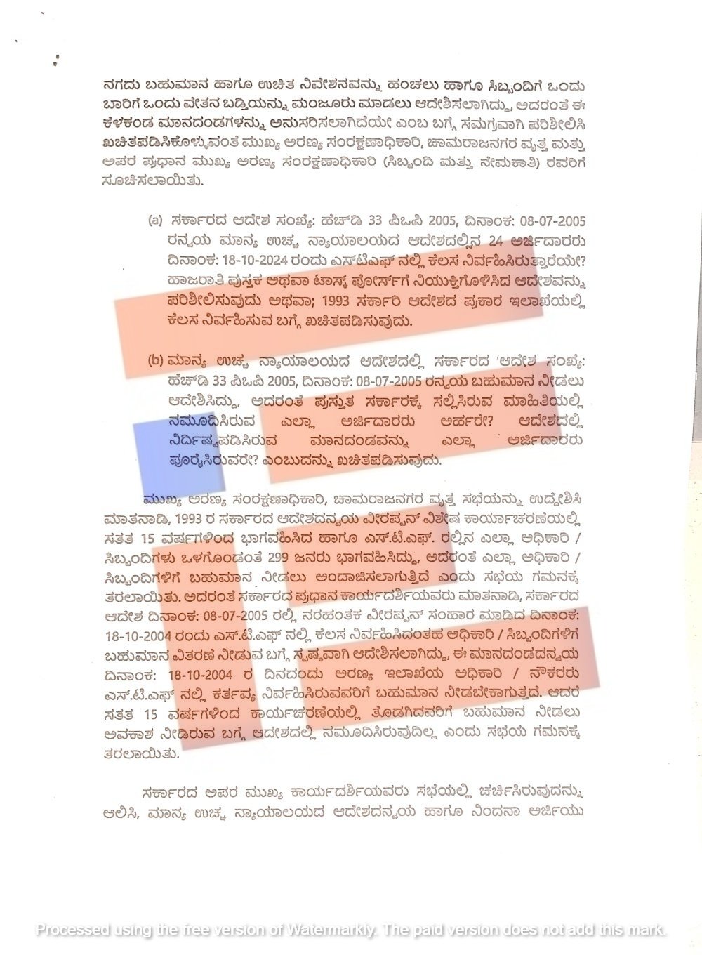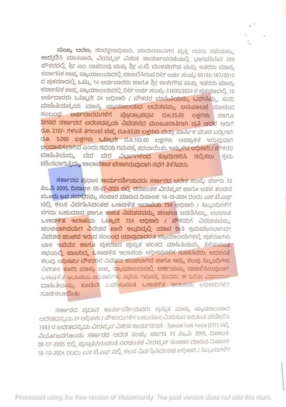 ಎಂ ರಾಜೇಂದ್ರ ಮತ್ತು ಎ ಟಿ ವೆಂಕಟೇಗೌಡ ಮತ್ತಿತರರು ಕರ್ನಾಟಕ ಹೈಕೋರ್ಟ್ನಲ್ಲಿ ಸಲ್ಲಿಸಿರುವ ರಿಟ್ ಅರ್ಜಿ (10982/2018, c/w 50155-167 dated 14.08.2024) ಗೆ ಸಂಬಂಧಿಸಿದಂತೆ ಇಲಾಖೆಯ ಸರ್ಕಾರದ ಹೆಚ್ಚುವರಿ ಮುಖ್ಯ ಕಾರ್ಯದರ್ಶಿ ಅಂಜುಮ್ ಪರ್ವೇಜ್ ಅವರ ಅಧ್ಯಕ್ಷತೆಯಲ್ಲಿ ನಡೆದ ಸಭೆಯು ವರದಿ ಸಲ್ಲಿಸಲು ನಿರ್ದೇಶಿಸಿದೆ.