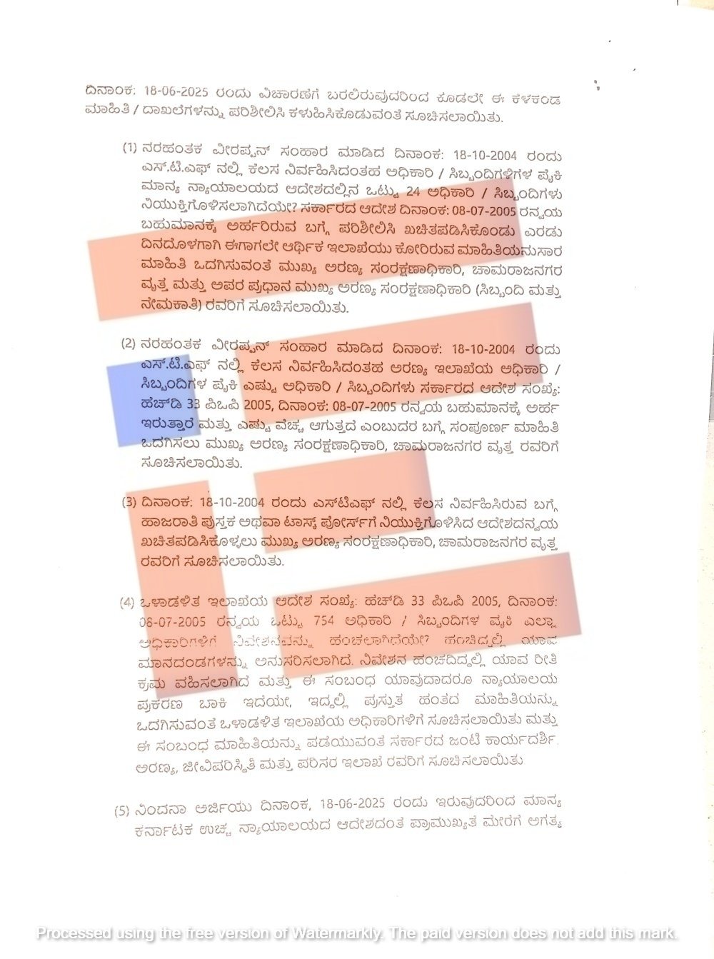 ‘ನರಹಂತಕ ವೀರಪ್ಪನ್ನ್ನು 2004ರ ಅಕ್ಟೋಬರ್ 18ರಂದು ಸಂಹಾರ ಮಾಡಿದ ದಿನದಂದು ಎಸ್ಟಿಎಫ್ನಲ್ಲಿ ಕೆಲಸ ನಿರ್ವಹಿಸಿದಂತಹ ಅಧಿಕಾರಿ ಸಿಬ್ಬಂದಿಗಳ ಪೈಕಿ ನ್ಯಾಯಾಲಯದ ಆದೇಶದಲ್ಲಿನ ಒಟ್ಟು 24 ಅಧಿಕಾರಿ ಸಿಬ್ಬಂದಿಗಳನ್ನು ನಿಯುಕ್ತಿಗೊಳಿಸಲಾಗಿದೆಯೇ, ಸರ್ಕಾರವು 2005ರ ಜುಲೈ 8ರಂದು ಹೊರಡಿಸಿದ್ದ ಆದೇಶದಂತೆ ಬಹುಮಾನಕ್ಕೆ ಅರ್ಹರಿರುವ ಬಗ್ಗೆ ಪರಿಶೀಲಿಸಿ ಖಚಿತಪಡಿಸಿಕೊಂಡು ಎರಡು ದಿನದೊಳಗಾಗಿ ಆರ್ಥಿಕ ಇಲಾಖೆಯು ಕೋರಿರುವ ಮಾಹಿತಿ ಅನುಸಾರ ಮಾಹಿತಿ ಒದಗಿಸಬೇಕು,’ ಎಂದು ಚಾಮರಾಜನಗರದ ಮುಖ್ಯ ಅರಣ್ಯ ಸಂರಕ್ಷಣಾಧಿಕಾರಿ ಮತ್ತು ಸಿಬ್ಬಂದಿ ಮತ್ತು ನೇಮಕಾತಿ ವಿಭಾಗದ ಎಪಿಸಿಸಿಎಫ್ ಅವರಿಗೆ ಸೂಚಿಸಿರುವುದು ನಡವಳಿಯಿಂದ ಗೊತ್ತಾಗಿದೆ.