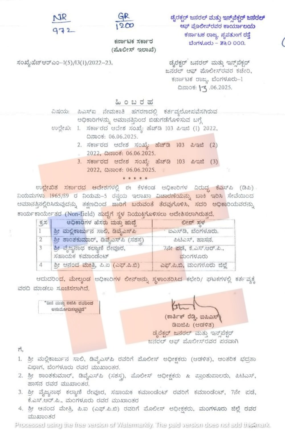 ಮಲ್ಲಿಕಾರ್ಜುನ ಸಾಲಿ (ಡಿವೈಎಸ್ಪಿ), ಶಾಂತಕುಮಾರ್ (ಡಿವೈಎಸ್ಪಿ, ಸಶಸ್ತ್ರ), ವೈಜ್ಯನಾಥ ಕಲ್ಯಾಣಿ ರೇವೂರ (ಸಹಾಯಕ ಕಮಾಂಡೆಂಟ್‌, ಪೊಲೀಸ್‌ ಇನ್ಸ್‌ಪೆಕ್ಟರ್‍‌ ಆನಂದ ಮೇತ್ರಿ ಇವರ ವಿರುದ್ಧದ ಇಲಾಖೆ ವಿಚಾರಣೆ ಬಾಕಿ ಇರಿಸಿ ಸೇವೆಯಿಂದ ಅಮಾನತಿನಲ್ಲಿರಿಸಿರುವುದನ್ನು ತಕ್ಷಣದಿಂದ ಜಾರಿಗೆ ಬರುವಂತೆ ತೆರವುಗೊಳಿಸಿ ಅಧಿಕಾರಿಯವರನ್ನು ಕಾರ್ಯಕಾರ್ಯೇತೇರ ಹುದ್ದೆಗೆ ಸ್ಥಳ ನಿಯುಕ್ತಿಗೊಳಿಸಿ 2025ರ ಜೂನ್‌ 6ರಂದೇ ಆದೇಶ ಹೊರಡಿಸಿದೆ.