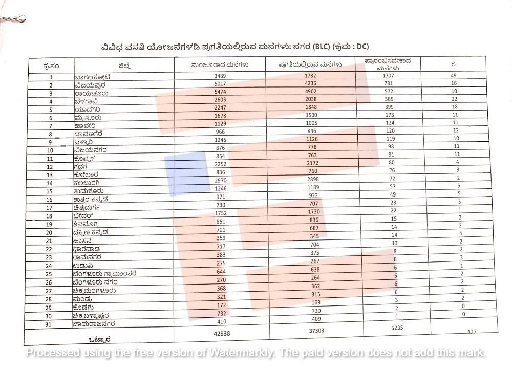ಅದೇ ರೀತಿ ವಿವಿಧ ವಸತಿ ಯೋಜನೆಗಳಡಿಯಲ್ಲಿ ನಗರ ವಿಭಾಗದಲ್ಲಿ ರಾಜ್ಯದ 31 ಜಿಲ್ಲೆಗಳಿಗೆ 42,538 ಮನೆಗಳು ಮಂಜೂರಾಗಿವೆ.