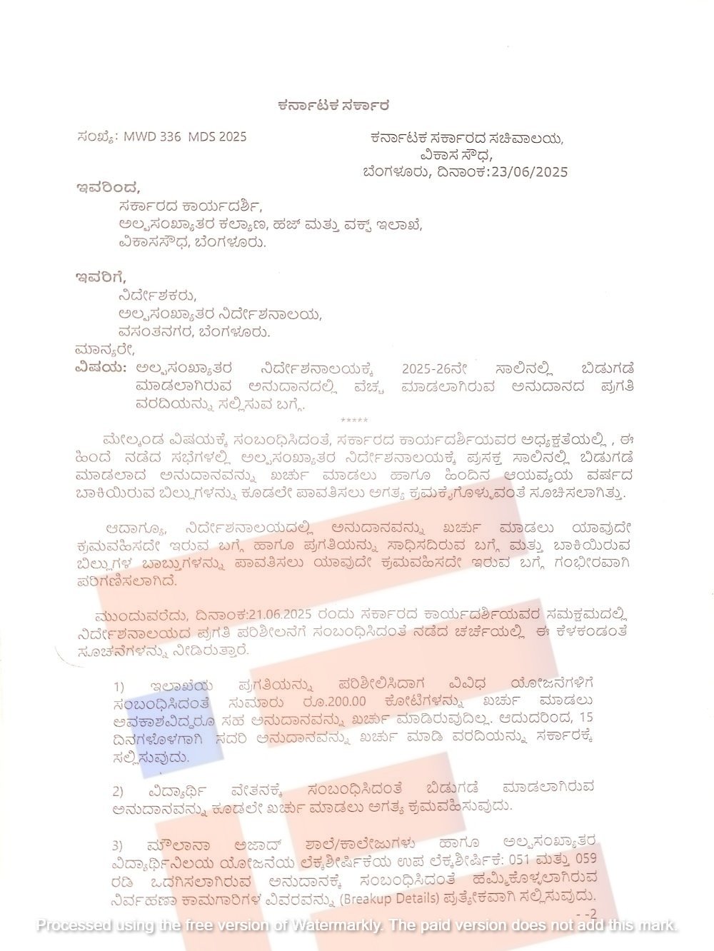 ಅಲ್ಪಸಂಖ್ಯಾತರ ನಿರ್ದೇಶನಾಲಯಕ್ಕೆ ಅನುದಾನ ಮಂಜೂರು, ಬಿಡುಗಡೆ ಕುರಿತು ಸರ್ಕಾರದ ಮುಖ್ಯ ಕಾರ್ಯದರ್ಶಿ ಅಧ್ಯಕ್ಷತೆಯಲ್ಲಿ 2025ರ ಜೂನ್ 21ರಂದು ಸಭೆ ನಡೆದಿತ್ತು. ಪ್ರಸಕ್ತ ಸಾಲಿನಲ್ಲಿ ಬಿಡುಗಡೆಯಾಗಿದ್ದ ಅನುದಾನ ಖರ್ಚು ಮಾಡಲು ಹಾಗೂ ಹಿಂದಿನ ಆಯವ್ಯಯ ವರ್ಷದ ಬಾಕಿ ಇರುವ ಬಿಲ್ಗಳನ್ನು ಪಾವತಿಸಲು ಕೂಡಲೇ ಕ್ರಮ ಕೈಗೊಳ್ಳಬೇಕು ಎಂದು ಸಭೆಯಲ್ಲಿ ಸೂಚಿಸಲಾಗಿತ್ತು.
