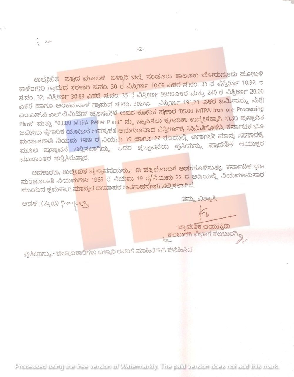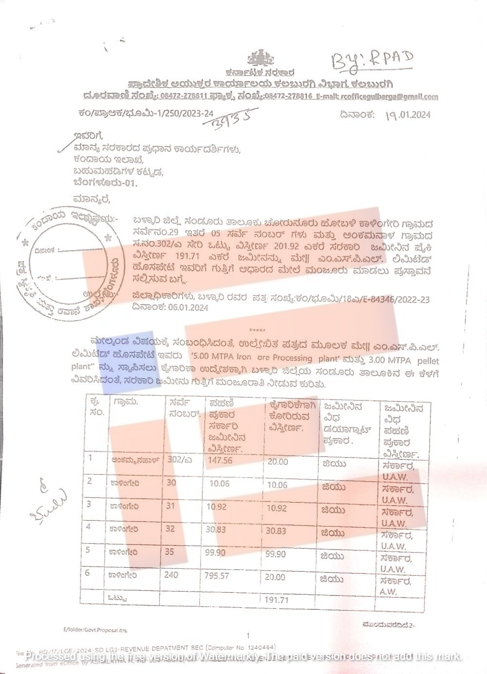 ಸಂಡೂರು ತಾಲೂಕಿನ ಚೋರನೂರು ಹೋಬಳಿ ಕಾಳಿಂಗೇರಿ ಗ್ರಾಮ ಮತ್ತು ಅಂಕಮನಾಳ ಗ್ರಾಮದ ವಿವಿಧ ಸರ್ವೆ ನಂಬರ್ಗಳಲ್ಲಿ 201.92 ಎಕರೆ ಪೈಕಿ 191 ಎಕರೆ71 ಗುಂಟೆ ಜಮೀನನ್ನು ಗುತ್ತಿಗೆ ಆಧಾರದ ಮೇಲೆ ಮಂಜೂರು ಮಾಡುವ ಕಲ್ಬುರ್ಗಿ ಪ್ರಾದೇಶಿಕ ಆಯುಕ್ತರು 2024ರ ಜನವರಿ 19ರಂದೇ ಪ್ರಸ್ತಾವ ಸಲ್ಲಿಸಿದ್ದಾರೆ. ಈ ಪ್ರಸ್ತಾವದ ಪ್ರತಿಯು ‘ದಿ ಫೈಲ್’ಗೆ ಲಭ್ಯವಾಗಿದೆ.