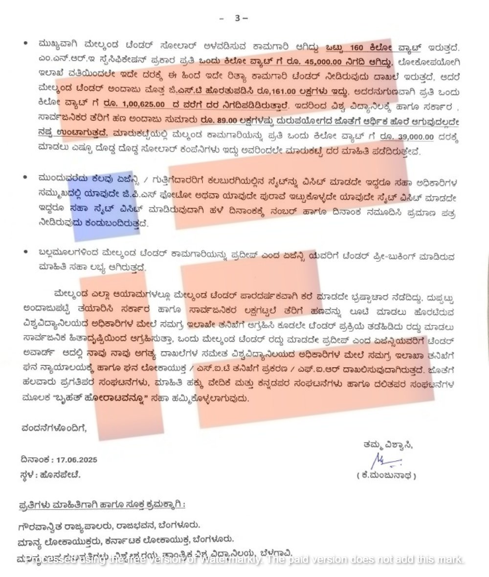 ಇದರ ಪ್ರಕಾರ ಪ್ರತಿ ಒಂದು ಕಿಲೋ ವ್ಯಾಟ್ಗೆ 1,00,625 ರು. ವರೆಗೆ ದರ ನಿಗದಿಪಡಿಸಿದಂತಾಗಿದೆ. ಇದರಿಂದ ವಿಶ್ವವಿದ್ಯಾಲಯಕ್ಕೆ ಹಾಗೂ ಸರ್ಕಾರದ ಬೊಕ್ಕಸಕ್ಕೆ ಆರ್ಥಿಕ ಹೊರೆಯಾಗಲಿದೆ. ಅಂದಾಜು 89.00 ಲಕ್ಷ ದುರುಪಯೋಗ ಆಗಲಿದೆ ಎಂದು ದೂರಿನಿಂದ ತಿಳಿದು ಬಂದಿದೆ.