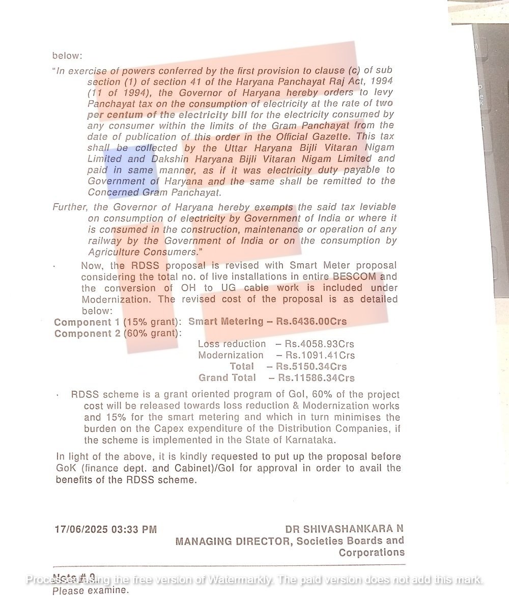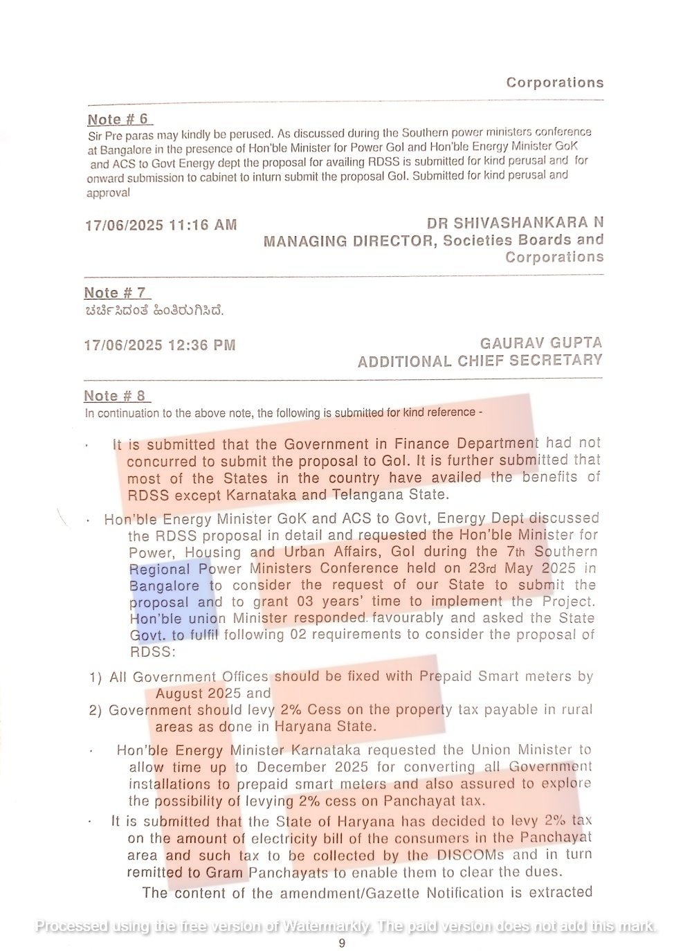 ಆರ್ಡಿಎಸ್ಎಸ್ ಪ್ರಸ್ತಾವವನ್ನು ಪರಿಗಣಿಸುವ ಸಂಬಂಧ ಆಗಸ್ಟ್ 2025 ರೊಳಗೆ ಎಲ್ಲಾ ಸರ್ಕಾರಿ ಕಚೇರಿಗಳಲ್ಲಿರುವ ಪ್ರಿಪೇಯ್ಡ್ಗಳನ್ನು ಸ್ಮಾರ್ಟ್ ಮೀಟರ್ಗಳನ್ನಾಗಿ ಪರಿವರ್ತಿಸಬೇಕು. ಮತ್ತು ಈ ಸಂಬಂಧ ಹರಿಯಾಣ ರಾಜ್ಯದಲ್ಲಿರುವಂತೆ ಗ್ರಾಮೀಣ ಪ್ರದೇಶಗಳಲ್ಲಿ ಪಾವತಿಸಬೇಕಾದ ಆಸ್ತಿ ತೆರಿಗೆಯ ಮೇಲೆ ಸರ್ಕಾರವು ಶೇ. 2ರಷ್ಟು ತೆರಿಗೆ ವಿಧಿಸಲು ಮಾರ್ಗಗಳನ್ನು ಶೋಧಿಸಬೇಕು. ಹರಿಯಾಣ ರಾಜ್ಯದ ಅಧಿಕೃತ ಗೆಜೆಟ್ ಮತ್ತು ಉತ್ತರ ಹರಿಯಾಣ ಬಿಜ್ಲಿ ವಿತರಣ್ ನಿಗಮ್ ಹೊರಡಿಸಿರುವ ಸುತ್ತೋಲೆಯನ್ನು ಪರಿಶೀಲನೆ ಮಾಡಬೇಕು ಎಂದು ಅಧಿಕಾರಿಗಳು ಸಲಹೆ ನೀಡಿರುವುದು ಟಿಪ್ಪಣಿ ಹಾಳೆಯಿಂದ ಗೊತ್ತಾಗಿದೆ.