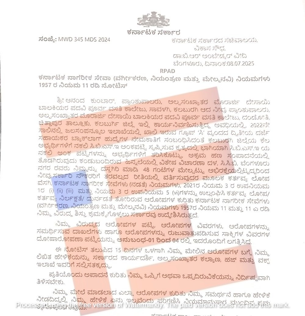 ಬೆಂಗಳೂರು; ಜಲಸಂಪನ್ಮೂಲ ಇಲಾಖೆಯ ‘ಸಿ’ ವೃಂದದ ದ್ವಿತೀಯ ದರ್ಜೆ ಸಹಾಯಕರ ಬ್ಯಾಕ್‌ಲಾಗ್‌ ಹುದ್ದೆ ಪಡೆಯಲು ನಕಲಿ ಸಿಬಿಎಸ್‌ಇ ಅಂಕಪಟ್ಟಿ ಸಲ್ಲಿಸಿ ವಂಚಿಸಿದ್ದ ಪ್ರಕರಣಕ್ಕೆ ಸಂಬಂಧಿಸಿದಂತೆ ಅಲ್ಪಸಂಖ್ಯಾತರ ಮೊರಾರ್ಜಿ ದೇಸಾಯಿ ವಸತಿ ಬಾಲಕಿಯರ ಪದವಿಪೂರ್ವ ಕಾಲೇಜಿನ ಪ್ರಾಂಶುಪಾಲ ಆನಂದ ಕುಂಬಾರ್‍‌ ಎಂಬುವರಿಗೆ ಸರ್ಕಾರವು ಒಂದು ವರ್ಷದ ನಂತರ ದೋಷಾರೋಪಣೆ ವಿವರಣೆ ಪಟ್ಟಿ ಜಾರಿಗೊಳಿಸಿದೆ.