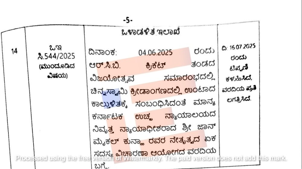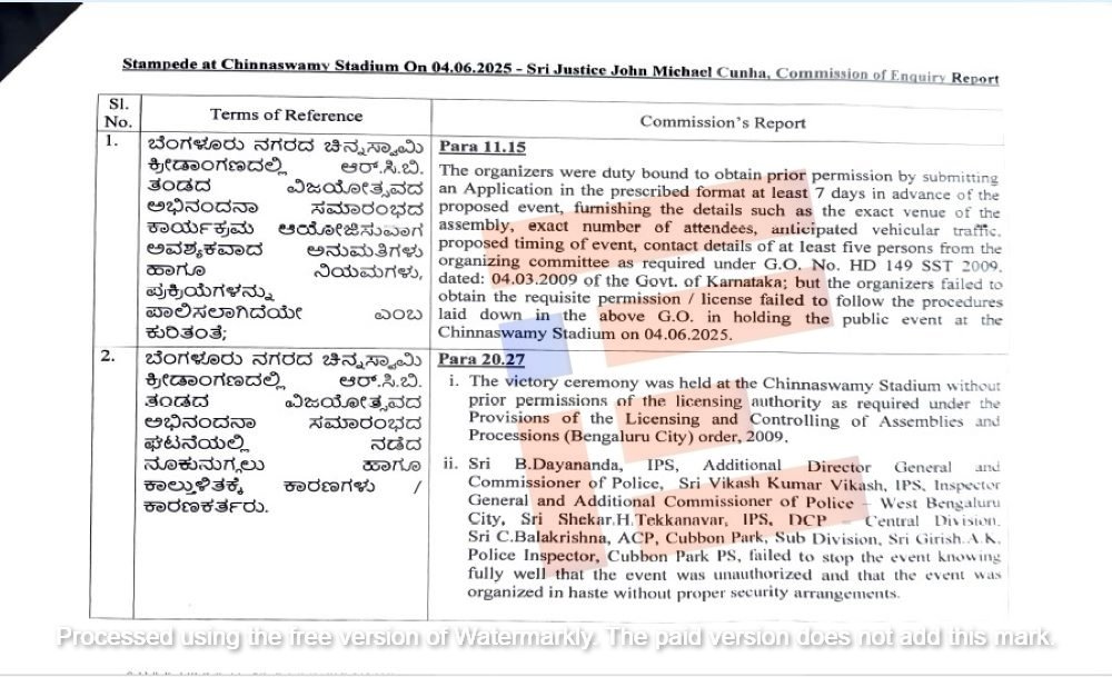 ಬೆಂಗಳೂರು; ಸಾರ್ವಜನಿಕ ಕಾರ್ಯಕ್ರಮವನ್ನು ಆಯೋಜಿಸುವುದಕ್ಕೆ ಸಂಬಂಧಿಸಿದಂತೆ 2009ರಲ್ಲಿನ ಸುತ್ತೋಲೆಯಲ್ಲಿ ನಿಗದಿಪಡಿಸಿದ್ದ ಕಾರ್ಯವಿಧಾನಗಳನ್ನು ಅನುಸರಿಸುವಲ್ಲಿ ಚಿನ್ನಸ್ವಾಮಿ ಕ್ರೀಡಾಂಗಣದ ವ್ಯವಸ್ಥಾಪಕರು ಮತ್ತು ಆರ್ಸಿಬಿ ಸಂಘಟಕರು ವಿಫಲರಾಗಿದ್ದರು. ಕ್ರೀಡಾಂಗಣದ ಪ್ರವೇಶ ದ್ವಾರಗಳನ್ನು ನಿಯಂತ್ರಿಸದೇ ಇರುವುದೇ ಕಾಲ್ತುಳಿತ, ಸಾವು, ನೋವುಗಳಿಗೆ ಮೂಲ ಕಾರಣ ಎಂದು ನಿವೃತ್ತ ನ್ಯಾಯಾಧೀಶ ಮೈಕಲ್ ಕುನ್ಹಾ ನೇತೃತ್ವದ ಆಯೋಗವು ಸರ್ಕಾರಕ್ಕೆ ಸಲ್ಲಿಸಿರುವ ವರದಿಯಲ್ಲಿ ವಿವರಿಸಿದೆ.