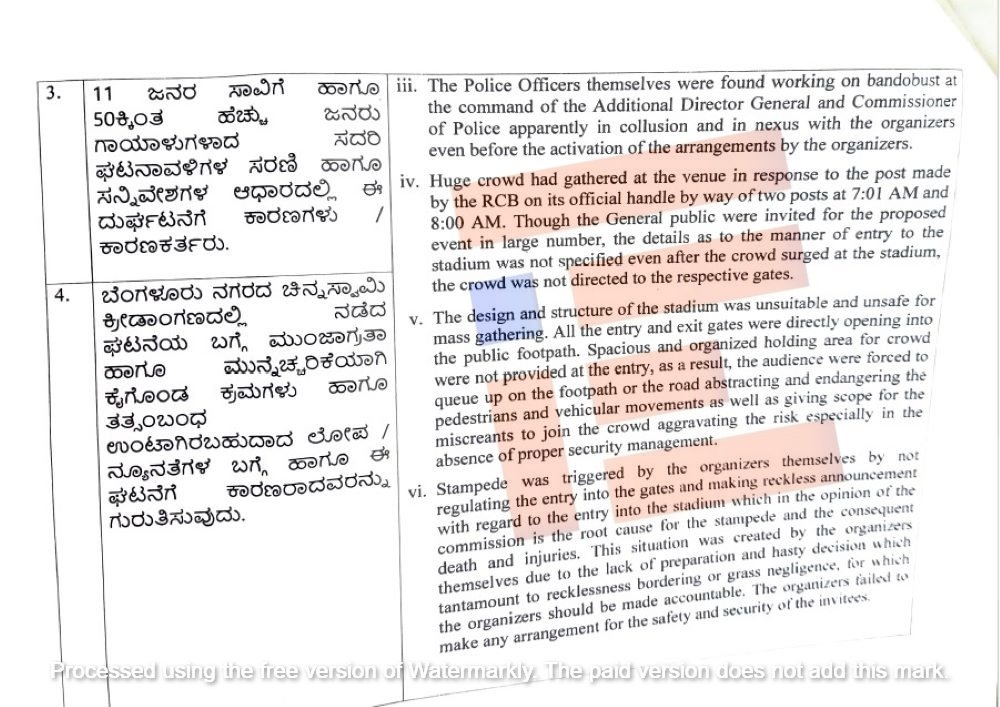 ಡಿಜಿಪಿ ಮತ್ತು ಪೊಲೀಸ್ ಆಯುಕ್ತರ ಆದೇಶದ ಮೇರೆಗೆ ಪೊಲೀಸ್ ಅಧಿಕಾರಿಗಳೇ ಬಂದೋಬಸ್ತ್ನಲ್ಲಿ ಕಾರ್ಯನಿರ್ವಹಿಸಿದ್ದರು. ವ್ಯವಸ್ಥೆಗಳನ್ನು ಸಕ್ರೀಯಗೊಳಿಸುವ ಮುನ್ನವೇ ಸಂಘಟಕರ ಜೊತೆ ಶಾಮೀಲಾಗಿದ್ದರು. ಆರ್ಸಿಬಿಯೂ ಸಹ ಅಧಿಕೃತವಾಗಿ ಬೆಳಗ್ಗೆ 7;01 ಹಾಗೂ 8;00 ಗಂಟೆಗೆ ಸಾಮಾಜಿಕ ಜಾಲತಾಣದಲ್ಲಿ ಎರಡು ಪೋಸ್ಟ್ಗಳನ್ನು ಮಾಡಿತ್ತು. ಇದರಿಂದಾಗಿಯೆ ಸ್ಥಳದಲ್ಲಿ ಭಾರೀ ಜನಸಮೂಹ ಜಮಾಯಿಸಿತ್ತು. ಈ ಕಾರ್ಯಕ್ರಮಕ್ಕೆ ಹೆಚ್ಚಿನ ಸಂಖ್ಯೆಯಲ್ಲಿ ಸಾರ್ವಜನಿಕರನ್ನು ಆಹ್ವಾನಿಸಲಾಗಿತ್ತು. ಕ್ರೀಡಾಂಗಣದಲ್ಲಿ ಜನಸಂದಣಿ ಹೆಚ್ಚಾದ ನಂತರವೂ ಕ್ರೀಡಾಂಗಣಕ್ಕೆ ಪ್ರವೇಶ ವಿಧಾನ ವಿವರಗಳನ್ನು ನಿರ್ದಿಷ್ಟಪಡಿಸಿರಲಿಲ್ಲ ಎಂದು ಆಯೋಗವು ತನ್ನ ವರದಿಯಲ್ಲಿ ಒತ್ತಿ ಹೇಳಿರುವುದು ಗೊತ್ತಾಗಿದೆ.