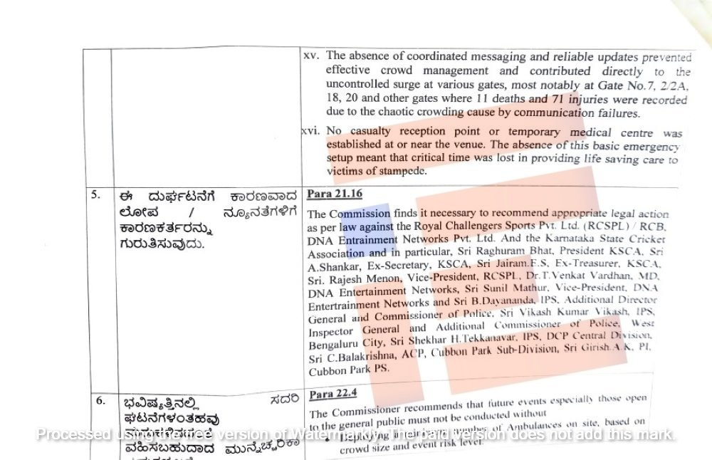 ಆರ್ಸಿಬಿ, ಡಿಎನ್ಎ, ಕರ್ನಾಟಕ ರಾಜ್ಯ ಕ್ರಿಕೆಟ್ ಅಸೋಸಿಯೇಷನ್ ಅಧ್ಯಕ್ಷ ರಘುರಾಮ್ ಭಟ್, ಮಾಜಿ ಕಾರ್ಯದರ್ಶಿ ಎ ಶಂಕರ್, ಮಾಜಿ ಖಜಾಂಚಿ ಜೈರಾಮ್, ರಾಜೇಶ್ ಮೆನನ್, ಡಾ ವೆಂಕಟ್ ವರ್ಧನ್, ಸುನೀಲ್ಮಾಥೂರ್ ಅವರೂ ಸಹ ಈ ದುರಂತಕ್ಕೆ ಹೊಣೆಗಾರರು ಎಂದು ಆಯೋಗವು ಹೆಸರಿಸಿದೆ.