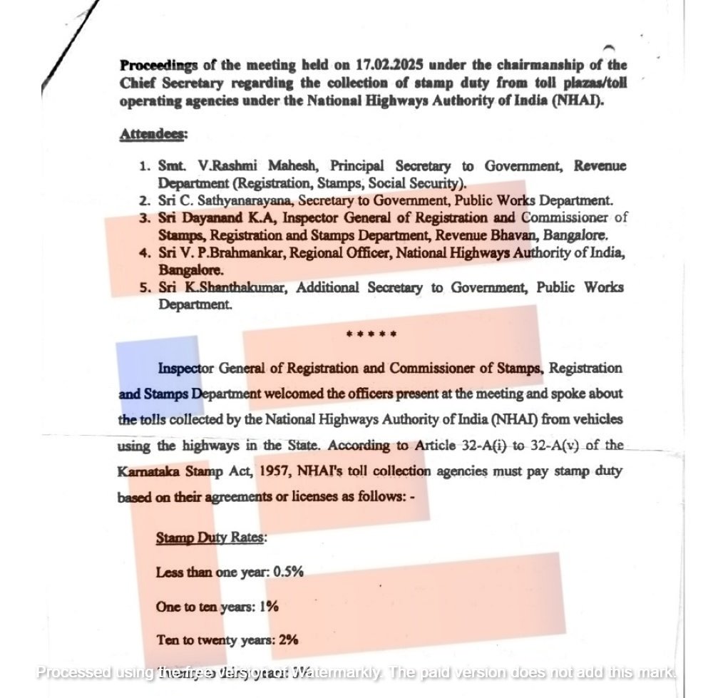 ಟೋಲ್ ಪ್ಲಾಜಾಗಳಿಂದ ಮುದ್ರಾಂಕ ಶುಲ್ಕ ಬಾಕಿ ಇರುವ ರಾಜ್ಯ ಸರ್ಕಾರದ ಮುಖ್ಯ ಕಾರ್ಯದರ್ಶಿಗಳ ಅಧ್ಯಕ್ಷತೆಯಲ್ಲಿ 2025ರ ಫೆ.17ರಂದು ಸಭೆ ನಡೆದಿತ್ತು. ಈ ಸಭೆಯಲ್ಲಿ ಬಾಕಿ ಇರುವ ಮುದ್ರಾಂಕ ಶುಲ್ಕ ವಸೂಲು ಮಾಡುವ ಕುರಿತು ಚರ್ಚೆ ನಡೆದಿದೆ.