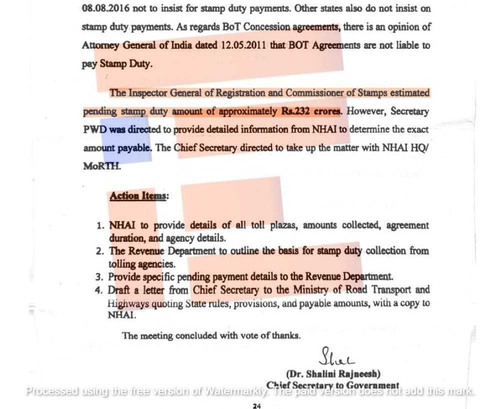 ಟೋಲ್ ಏಜೆನ್ಸಿಗಳು/ಗುತ್ತಿಗೆದಾರರೊಂದಿಗಿನ ಒಪ್ಪಂದಗಳು ದೆಹಲಿಯಲ್ಲಿ ಕಾರ್ಯಗತಗೊಂಡಿವೆ. ಹೀಗಾಗಿ ದೆಹಲಿಯಲ್ಲಿಯೇ ಮುದ್ರಾಂಕ ಶುಲ್ಕವನ್ನು ಪಾವತಿಸಲಾಗಿದೆ ಎಂದು ರಾಷ್ಟ್ರೀಯ ಹೆದ್ದಾರಿ ಪ್ರಾಧಿಕಾರದ ಪ್ರಾದೇಶಿಕ ಅಧಿಕಾರಿಗಳು ಸಭೆಗೆ ಮಾಹಿತಿ ಒದಗಿಸಿರುವುದು ಗೊತ್ತಾಗಿದೆ.