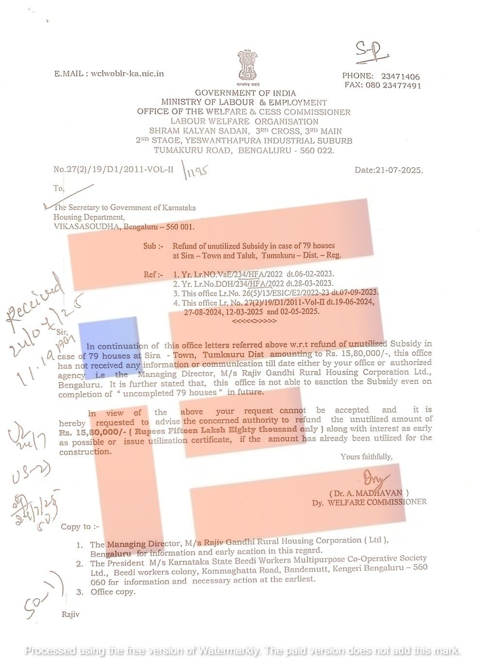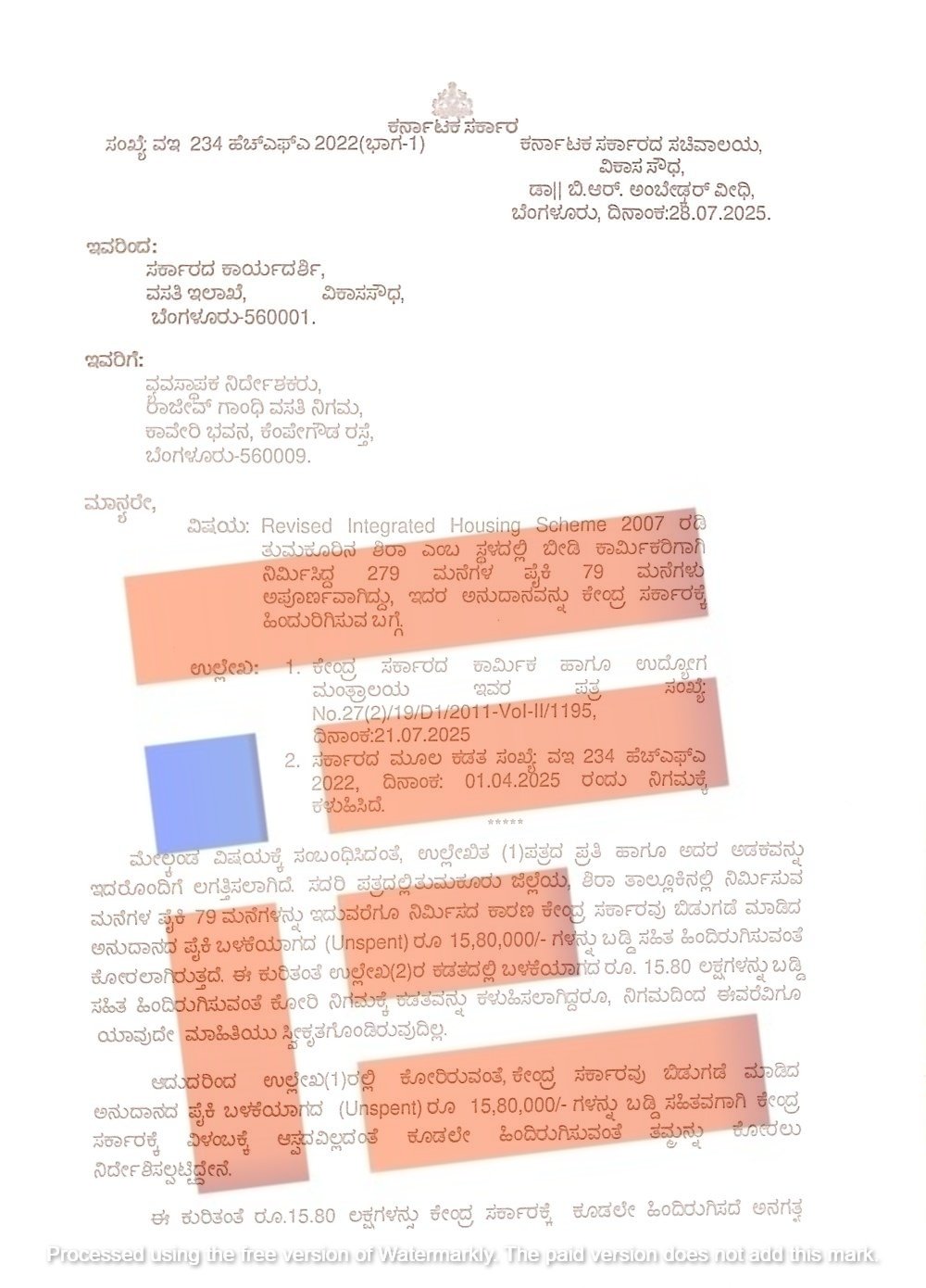 ತುಮಕೂರು ಜಿಲ್ಲೆಯ ಶಿರಾ ತಾಲೂಕಿನಲ್ಲಿ ಈ ಯೋಜನೆ ಪ್ರಕಾರ 279 ಮನೆಗಳನ್ನು ನಿರ್ಮಾಣ ಮಾಡಬೇಕಿತ್ತು. ಈ ಪೈಕಿ 79 ಮನೆಗಳು ಅಪೂರ್ಣವಾಗಿದೆ. ಹೀಗಾಗಿ ಅನುದಾನವನ್ನು ಕೇಂದ್ರ ಸರ್ಕಾರಕ್ಕೆ ಬಡ್ಡಿ ಸಮೇತ ವಾಪಸ್ ಮಾಡಬೇಕು ಎಂದು ಕೇಂದ್ರ ಸರ್ಕಾರದ ಕಾರ್ಮಿಕ ಹಾಗೂ ಉದ್ಯೋಗ ಸಚಿವಾಲಯವು 2025ರ ಜುಲೈ 21ರಂದು ಪತ್ರ ಬರೆದಿತ್ತು.
