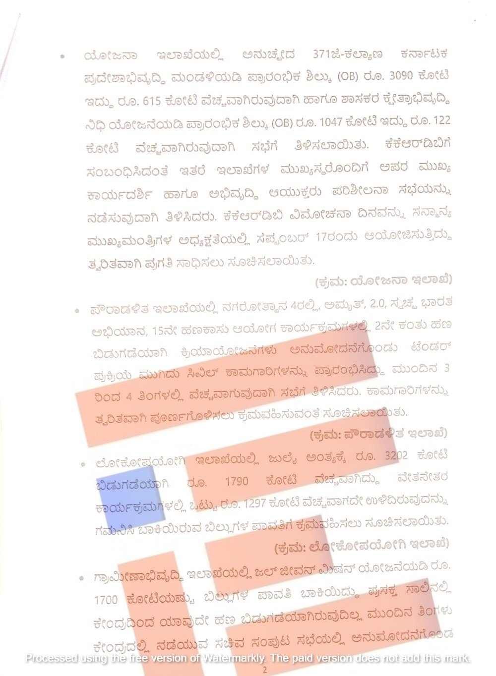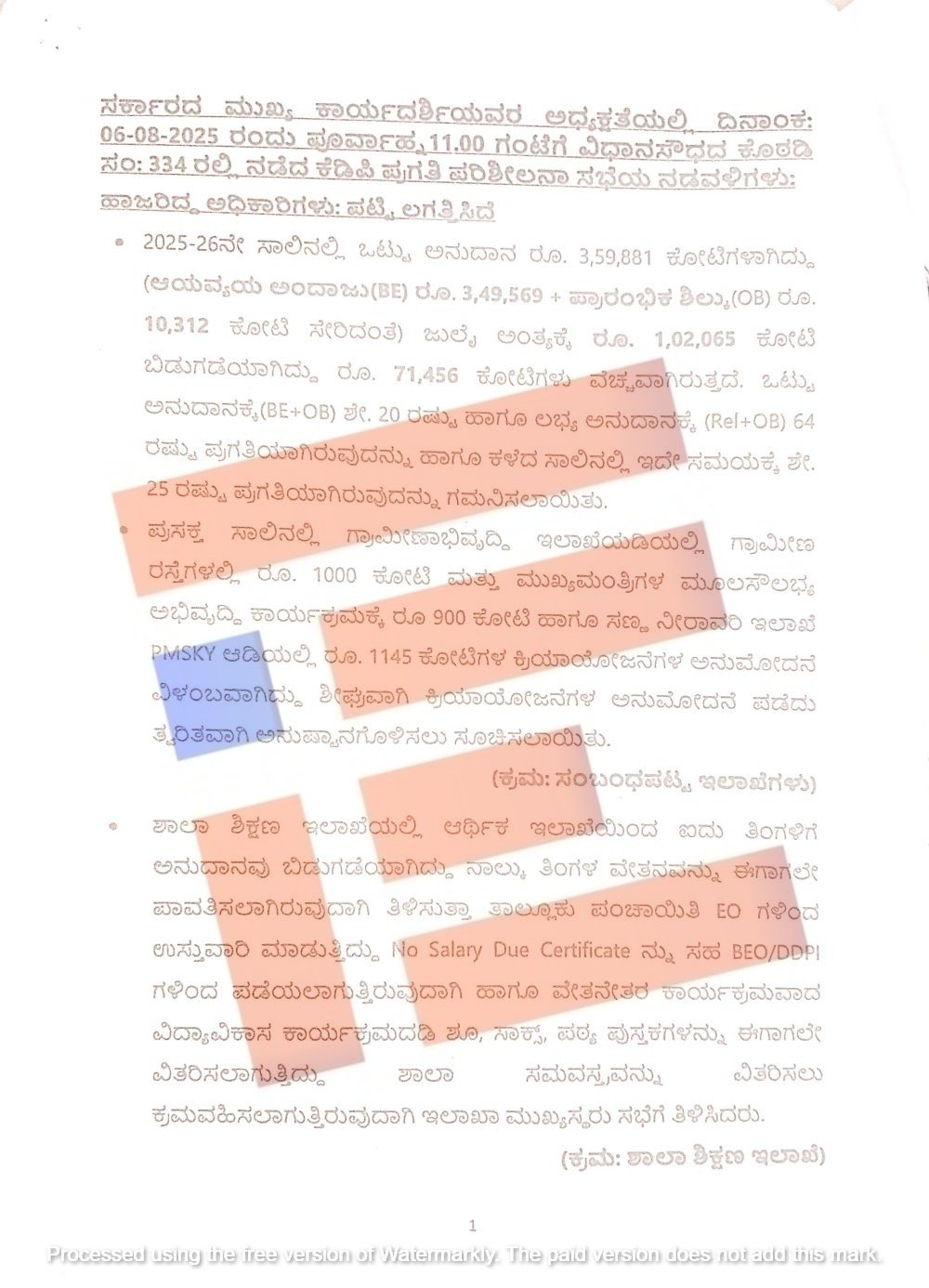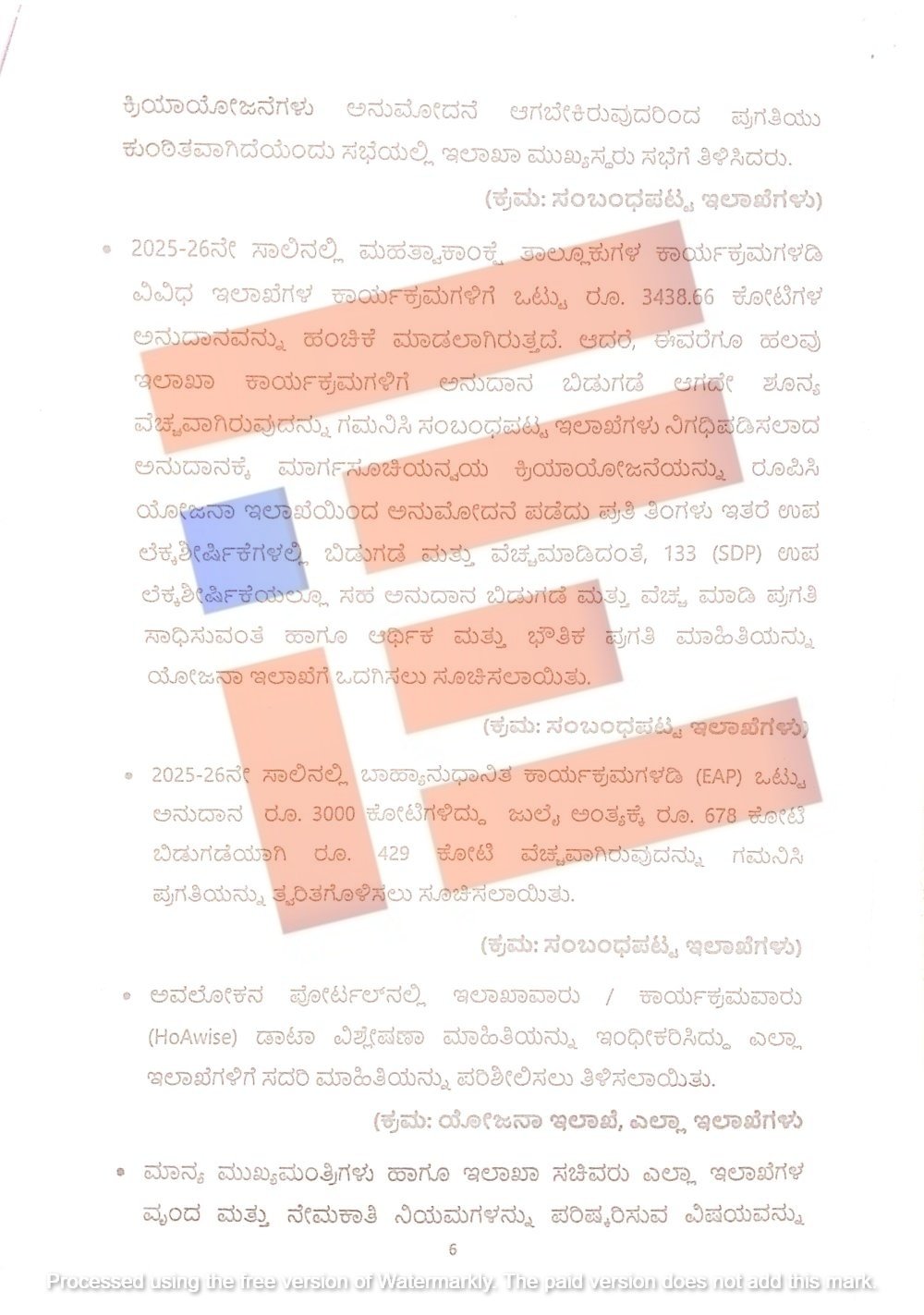 ಮುಖ್ಯ ಕಾರ್ಯದರ್ಶಿ ಡಾ ಶಾಲಿನಿ ರಜನೀಶ್ ಅವರ ಅಧ್ಯಕ್ಷತೆಯಲ್ಲಿ 2025ರ ಆಗಸ್ಟ್ 6ರಂದು ನಡೆದಿದ್ದ ಪ್ರಗತಿ ಪರಿಶೀಲನಾ ಸಭೆಯಲ್ಲಿ ಗ್ರಾಮೀಣಾಭಿವೃದ್ಧಿ ಸೇರಿದಂತೆ ಇತರೆ ಇಲಾಖೆಗಳ ಪ್ರಗತಿ ಕುರಿತು ಚರ್ಚೆ ನಡೆದಿತ್ತು. ಈ ಸಭೆಯಲ್ಲಿ ವಿವಿಧ ಇಲಾಖೆಗಳ ಕಾರ್ಯವೈಖರಿಯನ್ನು ಒರೆಗೆ ಹಚ್ಚಲಾಗಿದೆ. ಈ ಸಭೆಯ ನಡವಳಿ ಪ್ರತಿಯು ‘ದಿ ಫೈಲ್’ಗೆ ಲಭ್ಯವಾಗಿದೆ.