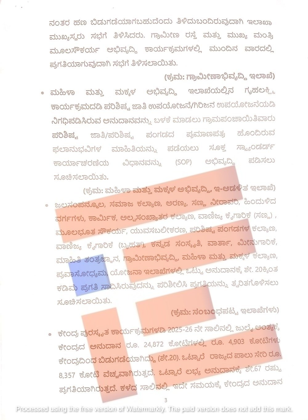 ಜಲಸಂಪನ್ಮೂಲ, ಸಮಾಜ ಕಲ್ಯಾಣ, ಅರಣ್ಯ, ಸಣ್ಣ ನೀರಾವರಿ, ಹಿಂದುಳಿದ ವರ್ಗಗಳು, ಕಾರ್ಮಿಕ, ಅಲ್ಪಸಂಖ್ಯಾತರ ಕಲ್ಯಾಣ, ವಾಣಿಜ್ಯ ಕೈಗಾರಿಕೆ, ಮೂಲಭೂತ ಸೌಕರ್ಯ, ಯುವ ಸಬಲೀಕರಣ, ಪರಿಶಿಷ್ಟ ಪಂಗಡಗಳ ಕಲ್ಯಾಣ, ಕನ್ನಡ ಸಂಸ್ಕೃತಿ, ವಾರ್ತಾ, ಮೀನುಗಾರಿಕೆ, ಮಾಹಿತಿ ತಂತ್ರಜ್ಞಾನ, ಗ್ರಾಮೀಣಾಭಿವೃದ್ಧಿ, ಮಹಿಳಾ ಮತ್ತು ಮಕ್ಕಳ ಕಲ್ಯಾಣ, ಪ್ರವಾಸೋದ್ಯಮ, ಯೋಜನಾ ಇಲಾಖೆಗಳಲ್ಲಿ ಒಟ್ಟು ಅನುದಾನಕ್ಕೆ ಶೇ. 20ಕ್ಕಿಂತಲೂ ಕಡಿಮೆ ಪ್ರಗತಿ ಸಾಧಿಸಿರುವುದು ನಡವಳಿಯಿಂದ ತಿಳಿದು ಬಂದಿದೆ.