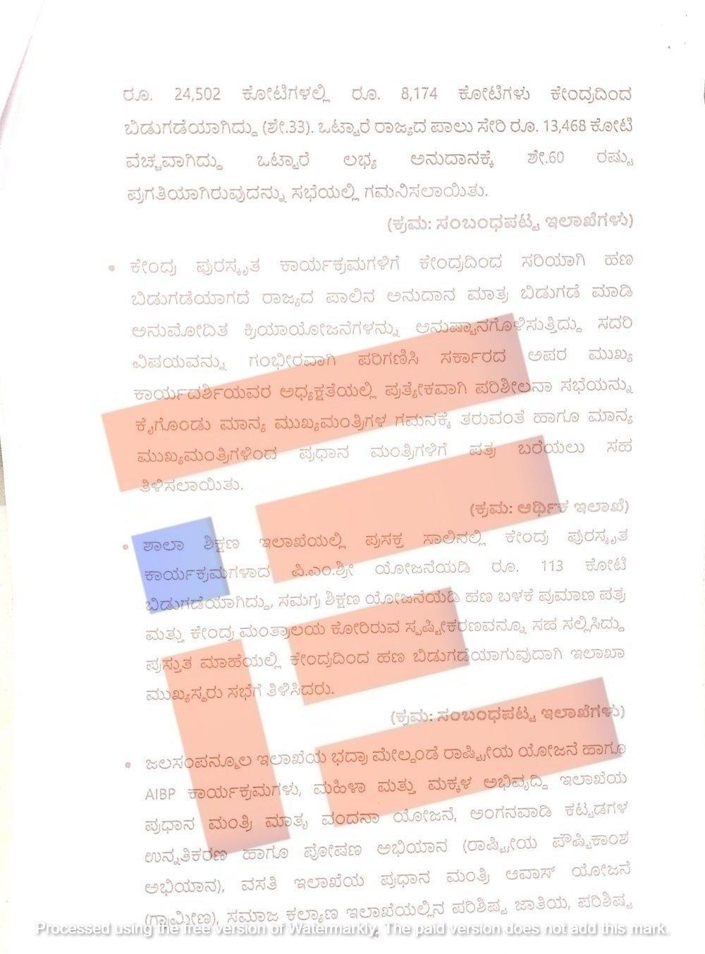 ಕೇಂದ್ರ ಪುರಸ್ಕೃತ ಕಾರ್ಯಕ್ರಮಗಳಿಗೆ ಕೇಂದ್ರದಿಂದ ಸರಿಯಾಗಿ ಹಣ ಬಿಡುಗಡೆಯಾಗುತ್ತಿಲ್ಲ. ರಾಜ್ಯದ ಪಾಲಿನ ಅನುದಾನ ಮಾತ್ರ ಬಿಡುಗಡೆ ಮಾಡಿ ಅನುಮೋದಿತ ಕ್ರಿಯಾ ಯೋಜನೆಗಳನ್ನು ಅನುಷ್ಠಾನಗೊಳಿಸಲಾಗುತ್ತಿದೆ. ಇದನ್ನು ರಾಜ್ಯ ಸರ್ಕಾರವು ಗಂಭೀರವಾಗಿ ಪರಿಗಣಿಸಿದೆ. ಈ ಕುರಿತು ಸರ್ಕಾರದ ಹೆಚ್ಚುವರಿ ಮುಖ್ಯ ಕಾರ್ಯದರ್ಶಿಗಳ ಅಧ್ಯಕ್ಷತೆಯಲ್ಲಿ ಪ್ರತ್ಯೇಕವಾಗಿ ಪರಿಶೀಲನಾ ಸಭೆಯನ್ನು ನಡೆಸಬೇಕು. ಈ ಕುರಿತು ಮುಖ್ಯಮಂತ್ರಿಗಳ ಗಮನಕ್ಕೆ ತಂದು ಪ್ರಧಾನ ಮಂತ್ರಿಗಳಿಗೆ ಪತ್ರ ಬರೆಯಲು ತಿಳಿಸಲು ಸಭೆಯು ಸೂಚಿಸಿರುವುದು ಗೊತ್ತಾಗಿದೆ.