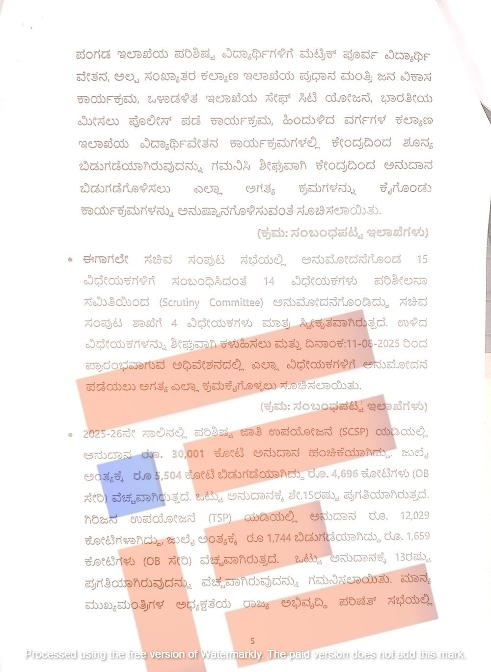 2025-26ನೇ ಸಾಲಿನಲ್ಲಿ ಪರಿಶಿಷ್ಟ ಜಾತಿ ಉಪಯೋಜನೆ (ಎಸ್ಸಿಎಸ್ಪಿ) ಅಡಿಯಲ್ಲಿ 30,001 ಕೋಟಿ ರು ಅನುದಾನ ಹಂಚಿಕೆಯಾಗಿದೆ. ಜುಲೈ ಅಂತ್ಯಕ್ಕೆ 5,504 ಕೋಟಿ ಬಿಡುಗಡೆಯಾಗಿದೆ. ಇದರಲ್ಲಿ 4,696 ಕೋಟಿ (ಆರಂಭಿಕ ಶಿಲ್ಕು ಸೇರಿ) ವೆಚ್ಚವಾಗಿದೆ. ಒಟ್ಟು ಅನುದಾನಕ್ಕೆ ಶೇ.15ರಷ್ಟು ಪ್ರಗತಿಯಾಗಿದೆ. ಅದೇ ರೀತಿ ಟಿಎಸ್ಪಿ ಅಡಿಯಲ್ಲಿ 12,029 ಕೋಟಿ ರು ಅನುದಾನ ಹಂಚಿಕೆಯಾಗಿದೆ. ಜುಲೈ ಅಂತ್ಯಕ್ಕೆ 1,744 ಕೋಟಿ ಬಿಡುಗಡೆಯಾಗಿದೆ. ಇದರಲ್ಲಿ 1,659 ಕೋಟಿ ವೆಚ್ಚವಾಗಿದೆ. ಒಟ್ಟು ಅನುದಾನಕ್ಕೆ ಶೇ. 13ರಷ್ಟು ಪ್ರಗತಿಯಾಗಿದೆ.