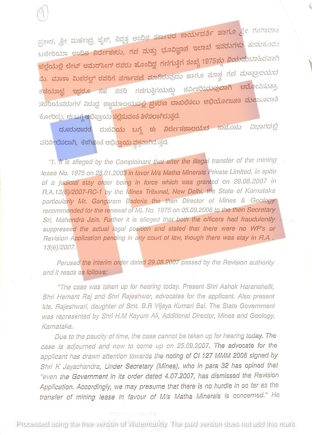 ಈ ಪ್ರಕರಣದಲ್ಲಿ ಹಿರಿಯ ಐಎಎಸ್ ಅಧಿಕಾರಿ ಹಾಗೂ ಹಾಲಿ ರೇರಾದ ತಾಂತ್ರಿಕ ಮತ್ತು ಆಡಳಿತಾತ್ಮಕ ಸದಸ್ಯ ಮಹೇಂದ್ರ ಜೈನ್ ಮತ್ತು ನಿವೃತ್ತ ಐಎಎಸ್ ಅಧಿಕಾರಿ ಗಂಗಾರಾಂ ಬಡೇರಿಯಾ ವಿರುದ್ಧದ ಆರೋಪಗಳು ಮೇಲ್ನೋಟಕ್ಕೆ ಸಾಬೀತಾಗಿದೆ ಎಂದು ಗಣಿ ಮತ್ತು ಭೂ ವಿಜ್ಞಾನ ಇಲಾಖೆಯ ಕಾನೂನು ವಿಭಾಗವು ಅಭಿಪ್ರಾಯ ನೀಡಿದೆ.