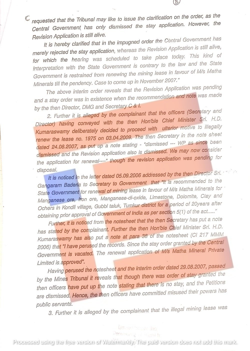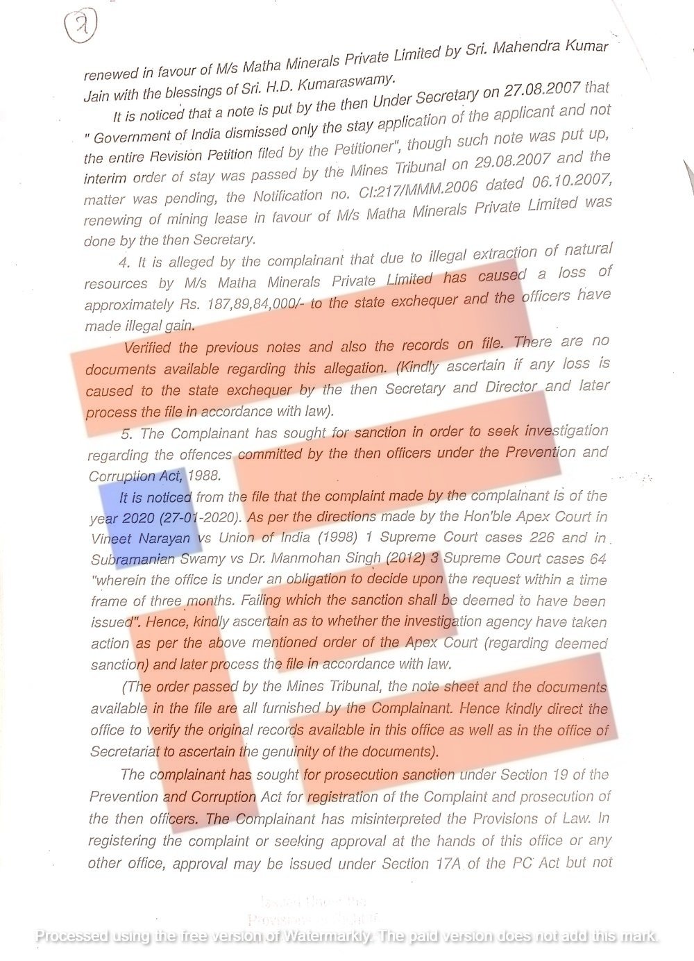 ‘ಸರ್ಕಾರದ ಅಂದಿನ ಕಾರ್ಯದರ್ಶಿ ಮಹೇಂದ್ರ ಜೈನ್ ಮತ್ತು ಗಣಿ ಮತ್ತು ಭೂ ವಿಜ್ಞಾನ ಇಲಾಖೆಯ ಅಂದಿನ ನಿರ್ದೇಶಕ ಗಂಗಾರಾಂ ಬಡೇರಿಯಾ ಅವರು ತುಮಕೂರು ಜಿಲ್ಲೆಯಲ್ಲಿ ಅಮರ್ ಸಿಂಗ್ ಅವರು ಹೊಂದಿದ್ದ ಗಣಿ ಗುತ್ತಿಗೆ (ಸಂಖ್ಯೆ 1975)ಯನ್ನು ನಿಯಮಬಾಹಿರವಾಗಿ ಮಾತಾ ಮಿನರಲ್ಸ್ಗೆ ವರ್ಗಾವಣೆ ಮಾಡಲಾಗಿದೆ. ಅಲ್ಲದೇ ಗಣಿ ಮಂತ್ರಾಲಯದ ತಡೆಯಾಜ್ಞೆ ಇದ್ದರೂ ಸಹ ಗಣಿ ಗುತ್ತಿಗೆಯನ್ನು ನವೀಕರಿಸಲಾಗಿದೆ. ಇವರುಗಳ ವಿರುದ್ಧ ನ್ಯಾಯಾಲಯದಲ್ಲಿ ಪ್ರಕರಣ ದಾಖಲಿಸಲು ಅಭಿಯೋಜನಾ ಮಂಜೂರಾತಿ ನೀಡಬೇಕು,’ ಎಂದು ಟಿ ಜೆ ಅಬ್ರಾಹಂ ಅವರು 2022ರ ನವೆಂಬರ್ 21ರಂದೇ ಕೋರಿದ್ದರು.