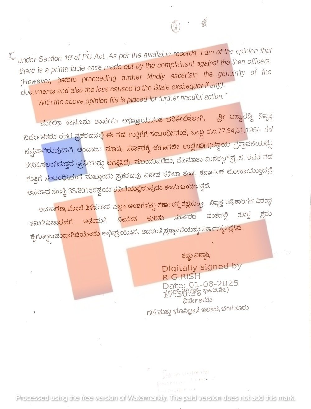 ‘ಆದ ಕಾರಣ ಮೇಲೆ ತಿಳಿಸಲಾದ ಎಲ್ಲಾ ಅಂಶಗಳನ್ನು ಸರ್ಕಾರಕ್ಕೆ ಸಲ್ಲಿಸುತತಾ ನಿವೃತ್ತ ಅಧಿಕಾರಿಗಳ ವಿರುದ್ಧ ತನಿಖೆ/ವಿಚಾರಣೆಗೆ ಅನುಮತಿ ನೀಡುವ ಕುರಿತು ಸರ್ಕಾರದ ಹಂತದಲ್ಲಿ ಸೂಕ್ತ ಕ್ರಮ ಕೈಗೊಳ್ಳಬಹುದಾಗಿದೆ. ಅದರಂತೆ ಪ್ರಸ್ತಾವನೆಯನ್ನು ಸರ್ಕಾರಕ್ಕೆ ಸಲ್ಲಿಸಿದೆ,’ ಎಂದು ಗಣಿ ಮತ್ತು ಭೂ ವಿಜ್ಞಾನ ಇಲಾಖೆಯ ನಿರ್ದೇಶಕ ಆರ್ ಗಿರೀಶ್ ಅವರು ಸರ್ಕಾರಕ್ಕೆ ಬರೆದ ಪತ್ರದಲ್ಲಿ ಕೋರಿರುವುದು ಗೊತ್ತಾಗಿದೆ.