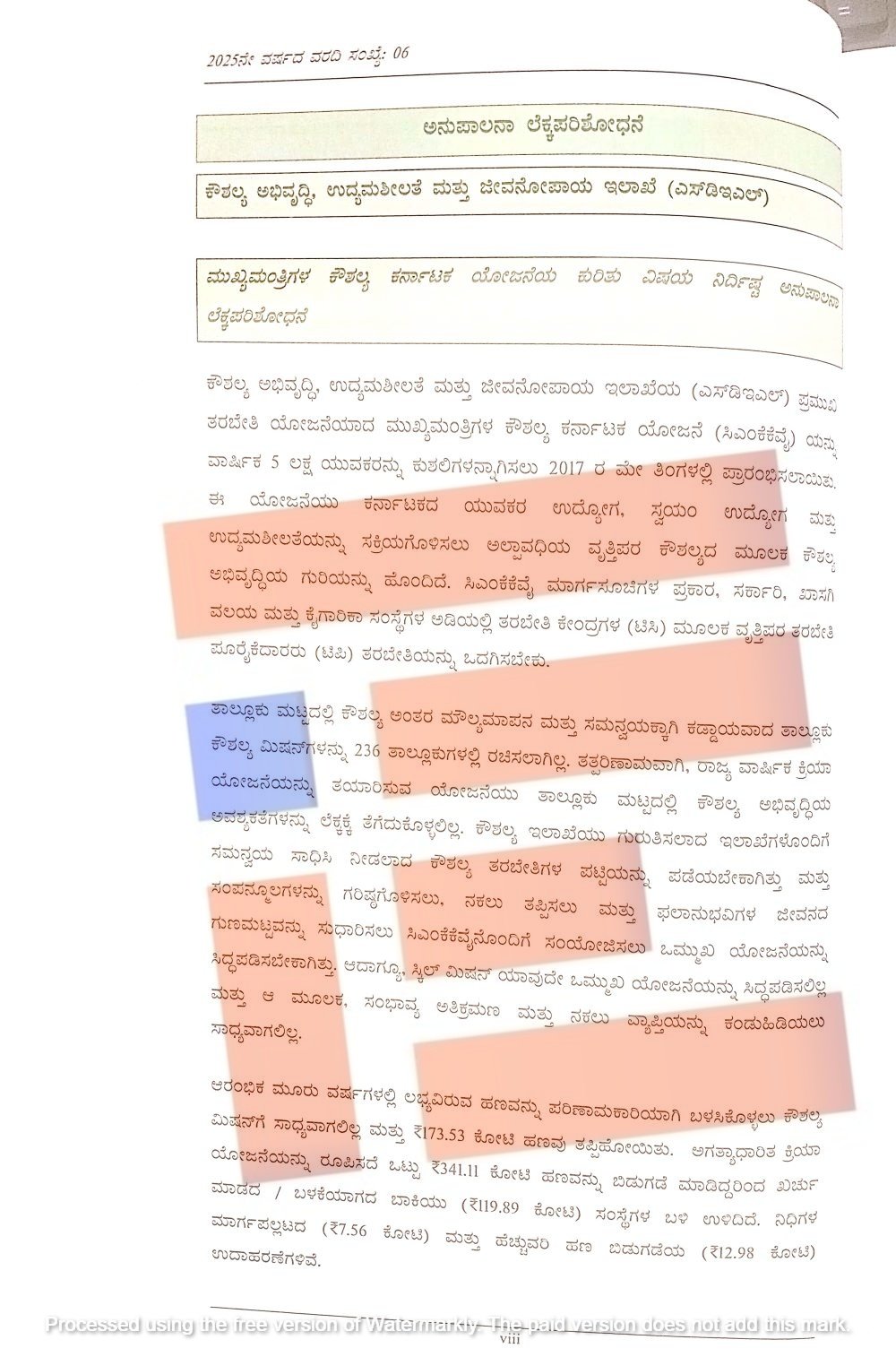 ಸಿಎಜಿಯು ಕರ್ನಾಟಕ ವಿಧಾನಮಂಡಲದಲ್ಲಿ ಸಲ್ಲಿಸಿರುವ ವರದಿಯು ಕೌಶಲ್ಯ ಅಭಿವೃದ್ಧಿ, ಉದ್ಯಮಶೀಲತೆ ಮತ್ತು ಜೀವನೋಪಾಯ ಇಲಾಖೆಯು ಜಾರಿಗೊಳಿಸಿರುವ ವಿವಿಧ ಯೋಜನೆಗಳು, ಬಿಡುಗಡೆಯಾದ ಅನುದಾನ ಮತ್ತು ಮಾಡಿರುವ ವೆಚ್ಚದ ಕುರಿತು ವಿಶ್ಲೇಷಣೆ ನಡೆಸಿದೆ.
