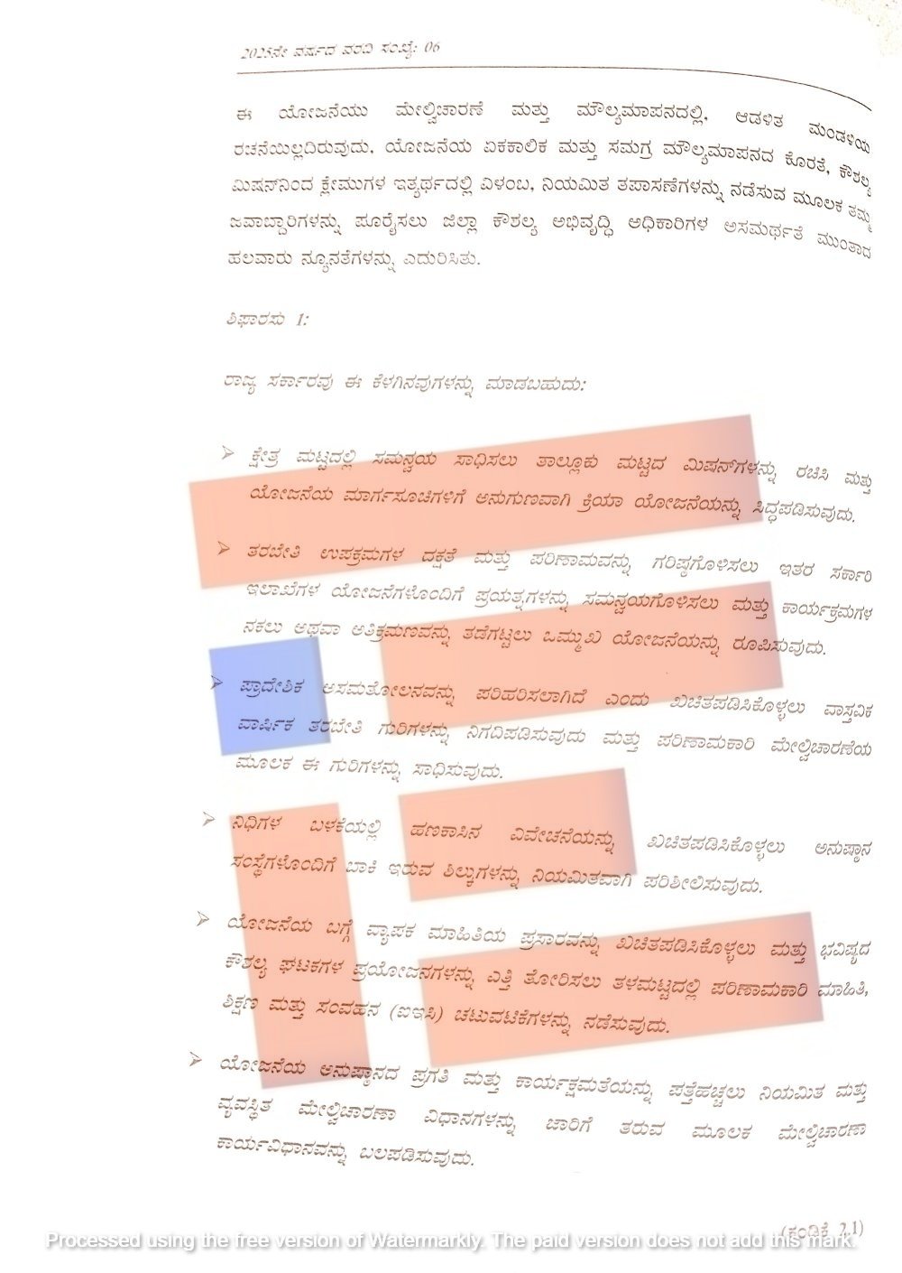 ಹೀಗಾಗಿ ರಾಜ್ಯ ವಾರ್ಷಿಕ ಕ್ರಿಯಾ ಯೋಜನೆಯನ್ನು ತಯಾರಿಸುವ ಯೋಜನೆಯು ತಾಲೂಕು ಮಟ್ಟದಲ್ಲಿ ಕೌಶಲ್ಯ ಅಭಿವೃದ್ಧಿಯ ಅವಶ್ಯಕತೆಗಳನ್ನು ಲೆಕ್ಕಕ್ಕೆ ತೆಗೆದುಕೊಳ್ಳಲಿಲ್ಲ. ಕೌಶಲ್ಯ ಇಲಾಖೆಯು ಗುರುತಿಸಿದ್ದ ಇಲಾಖೆಗಳೊಂದಿಗೆ ಸಮನ್ವಯ ಸಾಧಿಸಿ ನೀಡಿದ್ದ ಕೌಶಲ್ಯ ತರಬೇತಿಗಳ ಪಟ್ಟಿಯನ್ನು ಪಡೆಯಬೇಕಿತ್ತು. ಹಾಗೆಯೇ ಸಂಪನ್ಮೂಲಗಳನ್ನು ಗರಿಷ್ಠಗೊಳಿಸಲು, ನಕಲು ತಪ್ಪಿಸಲು ಮತ್ತು ಫಲಾನುಭವಿಗಳ ಜೀವನದ ಗುಣಮಟ್ಟವನ್ನು ಸುಧಾರಿಸಲು ಯೋಜನೆ ಸಿದ್ಧಪಡಿಸಬೇಕಿತ್ತು.