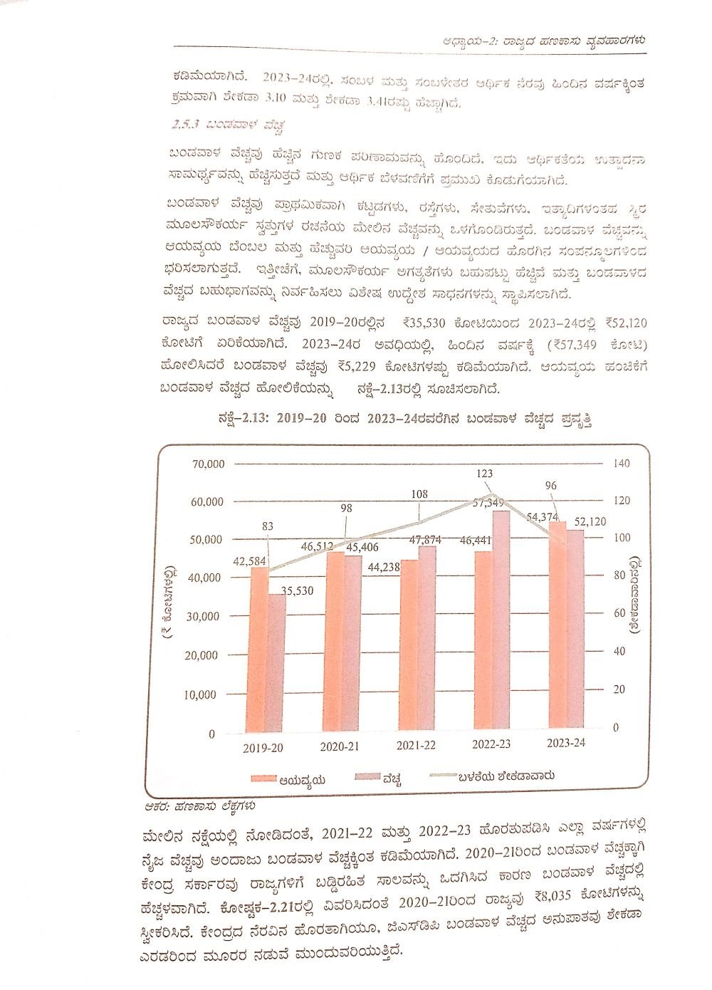 ಅದೇ ರೀತಿ ರಾಜ್ಯದ ಬಂಡವಾಳ ವೆಚ್ಚದಲ್ಲಿಯೂ ಕಡಿಮೆಯಾಗುತ್ತಿದೆ. 2019-20ರಲ್ಲಿ 35,530 ಕೋಟಿ ಇತ್ತು. 2023-24ರಲ್ಲಿ 52,120 ಕೋಟಿಗೆ ಏರಿಕೆಯಾಗಿದೆ. 2023-24ರ ಅವಧಿಯಲ್ಲಿ ಹಿಂದಿನ ವರ್ಷಕ್ಕೆ ಹೋಲಿಸಿದರೇ (57,349 ಕೋಟಿ) ಬಂಡವಾಳ ವೆಚ್ಚವು 5,229 ಕೋಟಿಗಳಷ್ಟು ಕಡಿಮೆಯಾಗಿದೆ. 2021-22 ಮತ್ತು 2022-23ರ ಹೊರತುಪಡಿಸಿ ಎಲ್ಲಾ ವರ್ಷಗಳಲ್ಲಿ ನೈಜ ವೆಚ್ಚವು ಅಂದಾಜು ಬಂಡವಾಳ ವೆಚ್ಚಕ್ಕಿಂತ ಕಡಿಮೆಯಾಗಿದೆ. 2020-21ರಿಂದ ಬಂಡವಾಳ ವೆಚ್ಚಕ್ಕಾಗಿ ಕೇಂದ್ರ ಸರ್ಕಾರವು ಬಡ್ಡಿ ರಹಿತ ಸಾಲ ಒದಗಿಸಿದ ಕಾರಣ ಬಂಡವಾಳ ವೆಚ್ಚದಲ್ಲಿ ಹೆಚ್ಚಳವಾಗಿದೆ. 2020-21 ರಿಂದ ರಾಜ್ಯವು 8,035 ಕೋಟಿಗಳನ್ನು ಸ್ವೀಕರಿಸಿದೆ.