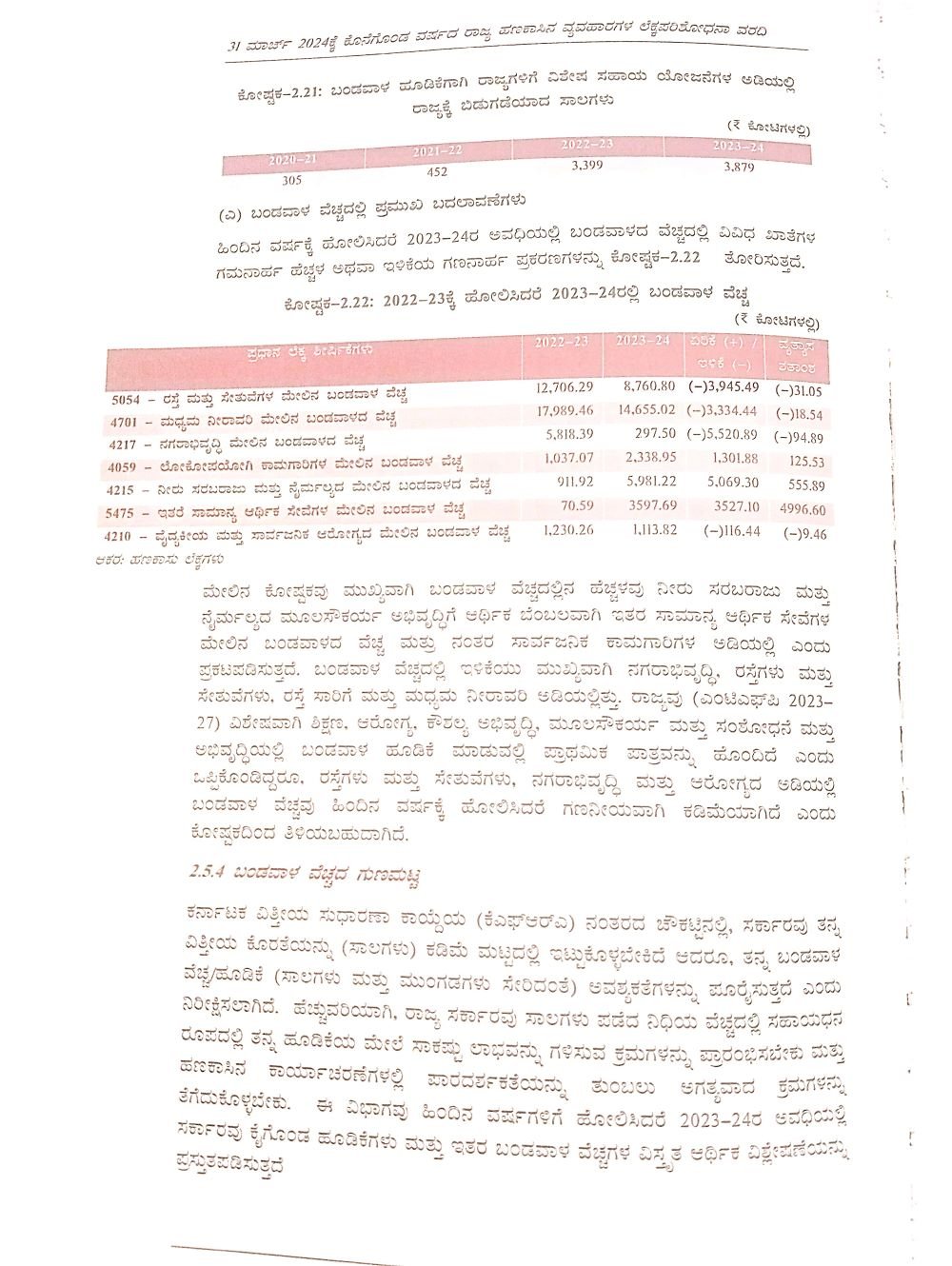 ಅಲ್ಲದೇ ರಾಜ್ಯದಲ್ಲಿ ನಗರಾಭಿವೃದ್ಧಿ, ರಸ್ತೆಗಳು, ಸೇತುವೆಗಳು, ರಸ್ತೆ ಸಾರಿಗೆ ಮತ್ತು ಮಧ್ಯಮ ನೀರಾವರಿ ವಲಯದಲ್ಲಿ ಬಂಡವಾಳ ವೆಚ್ಚವು 2023-24ರಲ್ಲಿ ಇಳಿಕೆಯಾಗಿದೆ. ಗ್ಯಾರಂಟಿ ಯೋಜನೆಗಳಿಗೆ ಹಣಕಾಸು ಹೊಂದಿಸುವುದರಲ್ಲೇ ಏದುಸಿರುಬಿಟ್ಟಿದ್ದರ ಹಿನ್ನೆಲೆಯಲ್ಲಿ ನಗರಾಭಿವೃದ್ಧಿ, ರಸ್ತೆ, ಸೇತುವೆಗಳು, ರಸ್ತೆ ಸಾರಿಗೆ, ಮಧ್ಯಮ ನೀರಾವರಿ ವಲಯದಲ್ಲಿ ಬಂಡವಾಳ ವೆಚ್ಚವನ್ನು ಕಡಿಮೆ ಮಾಡಿರುವ ಸಾಧ್ಯತೆ ಇದೆ ಎಂಬುದು ಮೇಲ್ನೋಟಕ್ಕೆ ಕಂಡು ಬಂದಿದೆ.