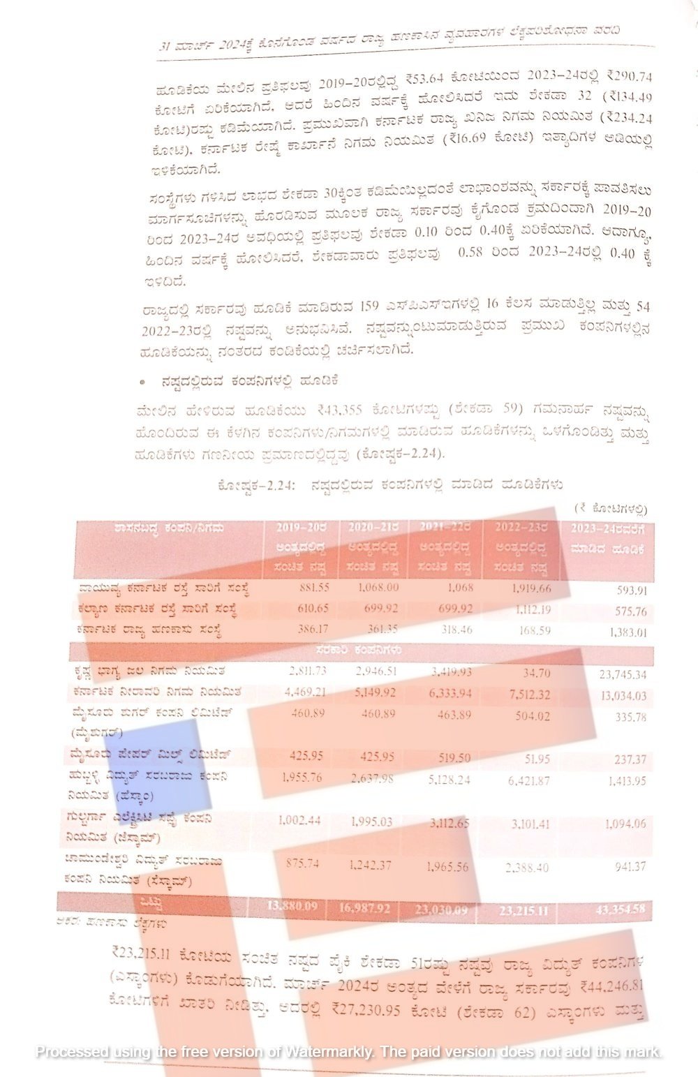 ಮೈಷುಗರ್ಸ್ನಲ್ಲಿ 2019-20ರಲ್ಲಿ 2019-20ರಲ್ಲಿ 460.89 ಕೋಟಿ, 2020-21ರಲ್ಲಿ 460.89 ಕೋಟಿ, 2021-22ರಲ್ಲಿ 463.89 ಕೋಟಿ, 2022-23ರಲ್ಲಿ 504.02 ಕೋಟಿ ಸಂಚಿತ ನಷ್ಟವನ್ನು ಹೊಂದಿತ್ತು. 2023-24ರವರೆಗೆ ಈ ಕಂಪನಿಯಲ್ಲಿ ಸರ್ಕಾರವು 335.78 ಕೋಟಿ ಹೂಡಿಕೆ ಮಾಡಿದೆ. ಹಾಗೆಯೇ ಶಿವಮೊಗ್ಗ ಜಿಲ್ಲೆಯ ಭದ್ರಾವತಿಯಲ್ಲಿ ಮುಚ್ಚಿ ಹೋಗಿರುವ ಮೈಸೂರ್ ಪೇಪರ್ಸ್ ಲಿಮಿಟೆಡ್ 2019-20ರಲ್ಲಿ 425.95 ಕೋಟಿ, 2020-21ರಲ್ಲಿ 425.95 ಕೋಟಿ, 2022-23ರಲ್ಲಿ 519.50 ಕೋಟಿ, 2022-23ರಲ್ಲಿ 51.95 ಕೋಟಿ ಸಂಚಿತ ನಷ್ಟವನ್ನು ಅನುಭವಿಸಿತ್ತು. 2023-24ರವರೆಗೆ ಈ ಕಂಪನಿಯಲ್ಲಿ ರಾಜ್ಯ ಸರ್ಕಾರವು 237.37 ಕೋಟಿಯಷ್ಟು ಹೂಡಿಕೆ ಮಾಡಿತ್ತು.