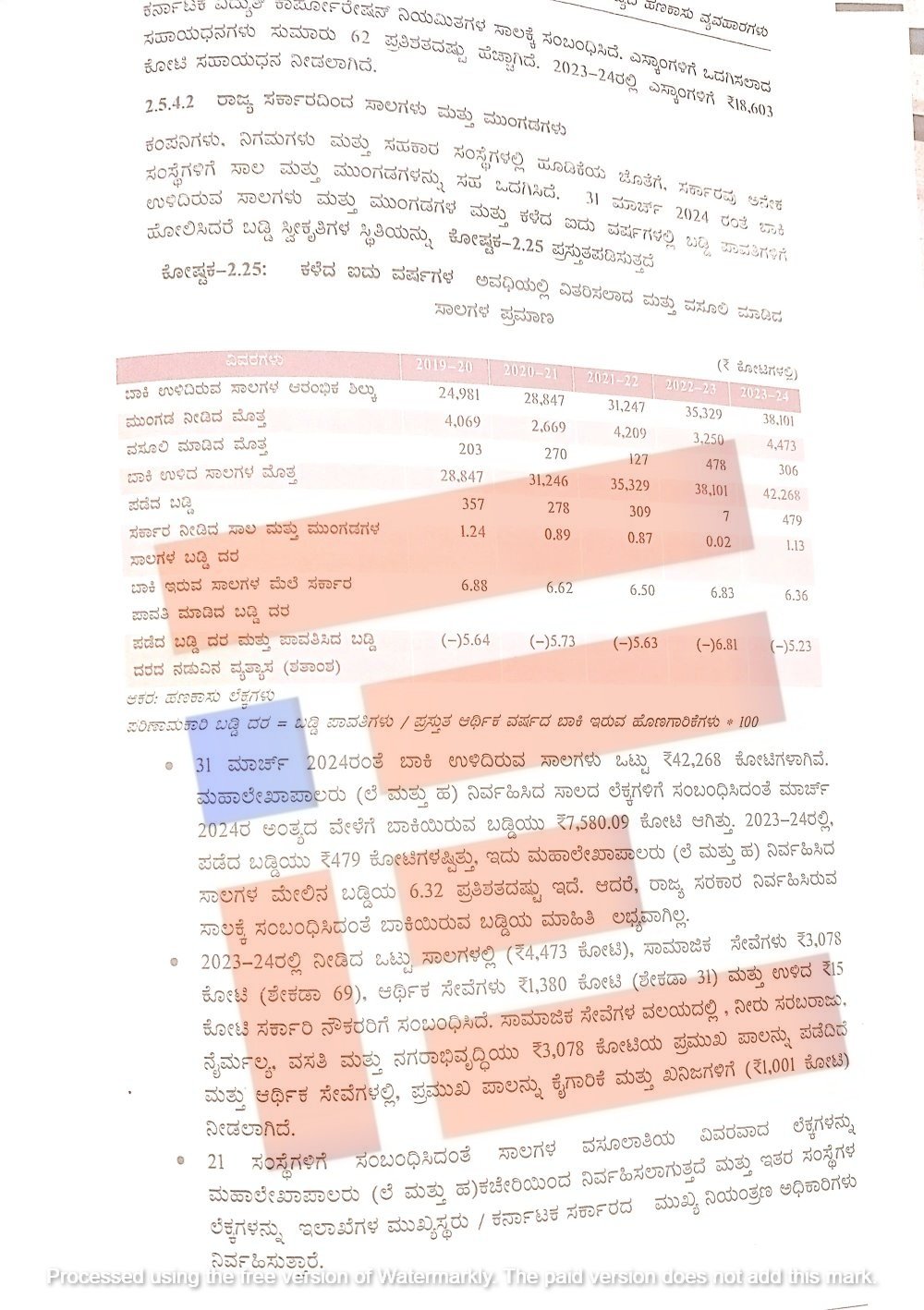 2019-20ರಲ್ಲಿ 24,981 ಕೋಟಿ, 2020-21ರಲ್ಲಿ 28,847 ಕೋಟಿ, 2021-22ರಲ್ಲಿ 31,247 ಕೋಟಿ, 2022-23ರಲ್ಲಿ 35,329 ಕೋಟಿ, 2023-24ರಲ್ಲಿ 38,101 ಕೋಟಿ ಸಾಲಗಳು ಬಾಕಿ ಉಳಿದಿತ್ತು. ಅಲ್ಲದೇ ಇದೇ ಅವಧಿಯಲ್ಲಿ ಒಟ್ಟಾರೆ 18,670 ಕೋಟಿಯಷ್ಟು ಮುಂಗಡ ನೀಡಿತ್ತು. ಈ ಪೈಕಿ ಕೇವಲ 1,384 ಕೋಟಿಯಷ್ಟು ಮಾತ್ರ ವಸೂಲಿ ಮಾಡಿತ್ತು.
