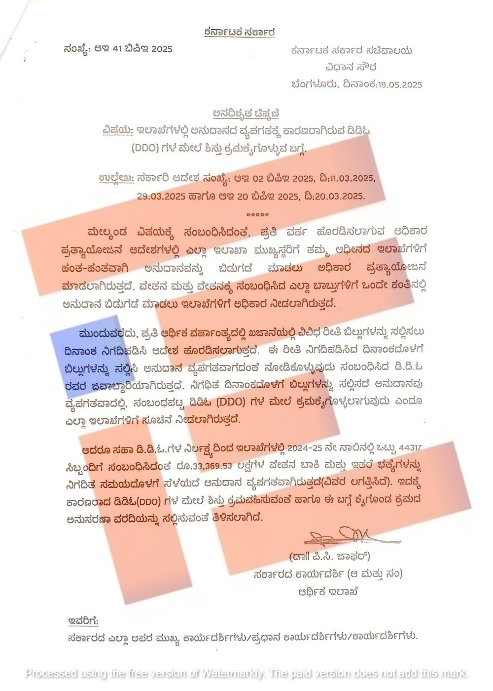 ‘ಆದರೂ ಸಹ ಡಿಡಿಓಗಳ ನಿರ್ಲಕ್ಷ್ಯದಿಂದ 2024-25ನೇ ಸಾಲಿನಲ್ಲಿ ಒಟ್ಟು 44,317 ಸಿಬ್ಬಂದಿಗೆ ಸಂಬಂಧಿಸಿದಂತೆ 333 ಕೋಟಿ ರುಗಳಷ್ಟು ವೇತನ ಬಾಕಿ ಮತ್ತು ಇತರೆ ಭತ್ಯೆಗಳನ್ನು ನಿಗದಿತ ಸಮಯದೊಳಗೆ ಸೆಳೆಯದೇ ಅನದುಆನವು ವ್ಯಪಗತವಾಗಿರುತ್ತದೆ. ಇದಕ್ಕೆ ಕಾರಣರಾದ ಡಿಡಿಓ ಗಳ ಮೇಲೆ ಶಿಸ್ತು ಕ್ರಮ ವಹಿಸಬೇಕು. ಮತ್ತು ಈ ಬಗ್ಗೆ ಕೈಗೊಂಡ ಕ್ರಮದ ಬಗ್ಗೆ ಅನುಸರಣಾ ವರದಿಯನ್ನು ಸಲ್ಲಿಸಬೇಕು,’ ಎಂದು 2025ರ ಮೇ 19ರಂದೇ ಡಾ ಪಿ ಸಿ ಜಾಫರ್ ಅವರು ಸರ್ಕಾರದ ಎಲ್ಲಾ ಇಲಾಖೆಗಳ ಹೆಚ್ಚುವರಿ ಮುಖ್ಯ ಕಾರ್ಯದರ್ಶಿ, ಪ್ರಧಾನ ಕಾರ್ಯದರ್ಶಿ, ಕಾರ್ಯದರ್ಶಿಗಳಿಗೆ ಸೂಚಿಸಿದ್ದರು.